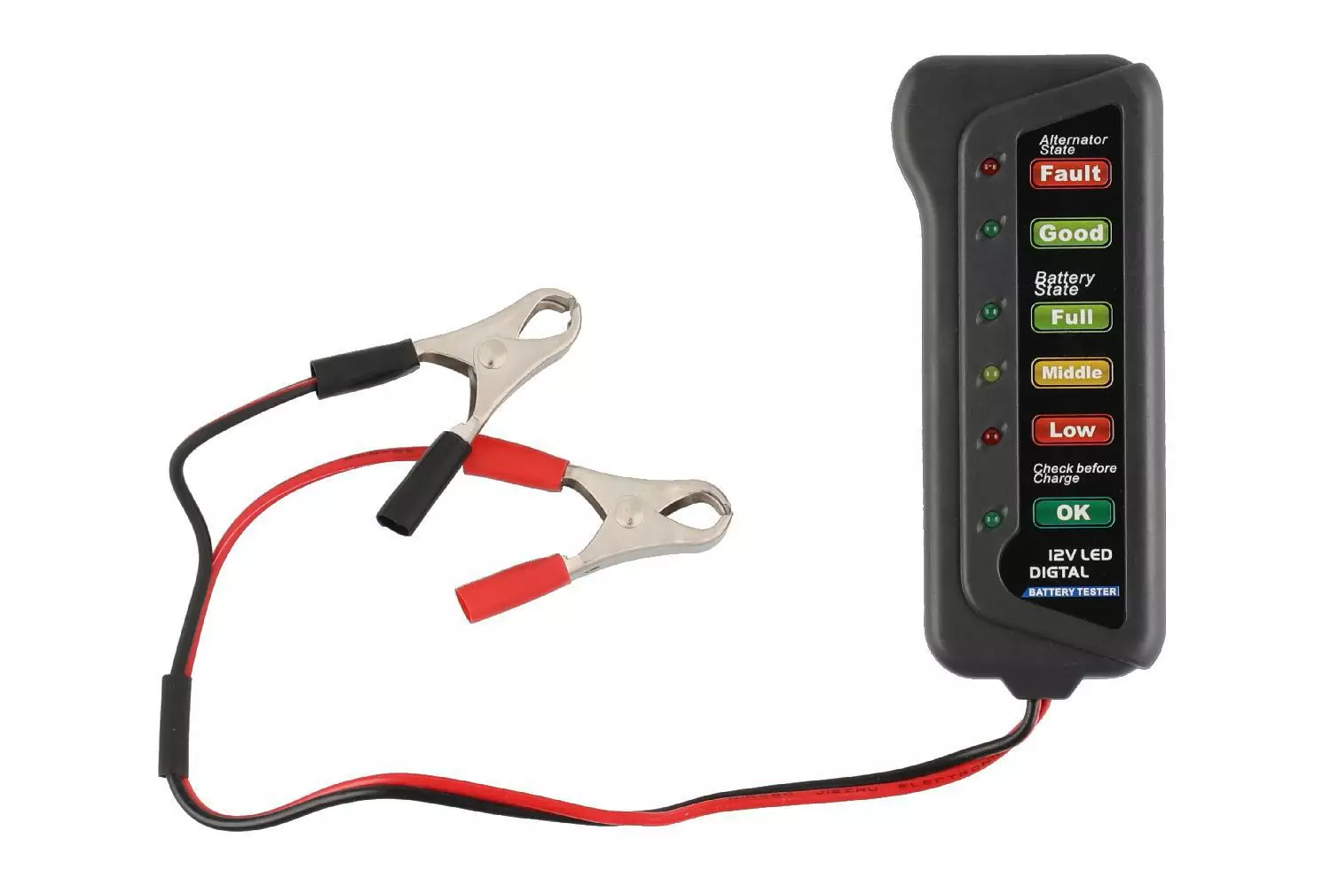 Akkutesteri 12V lyijyakuille. Testaa akun kunto helposti yhdistämällä testerissä olevat hauenleuat akun napoihin. Selkeä näyttö led-valoilla ilmaisee kolmiportaisesti akun kunnon.