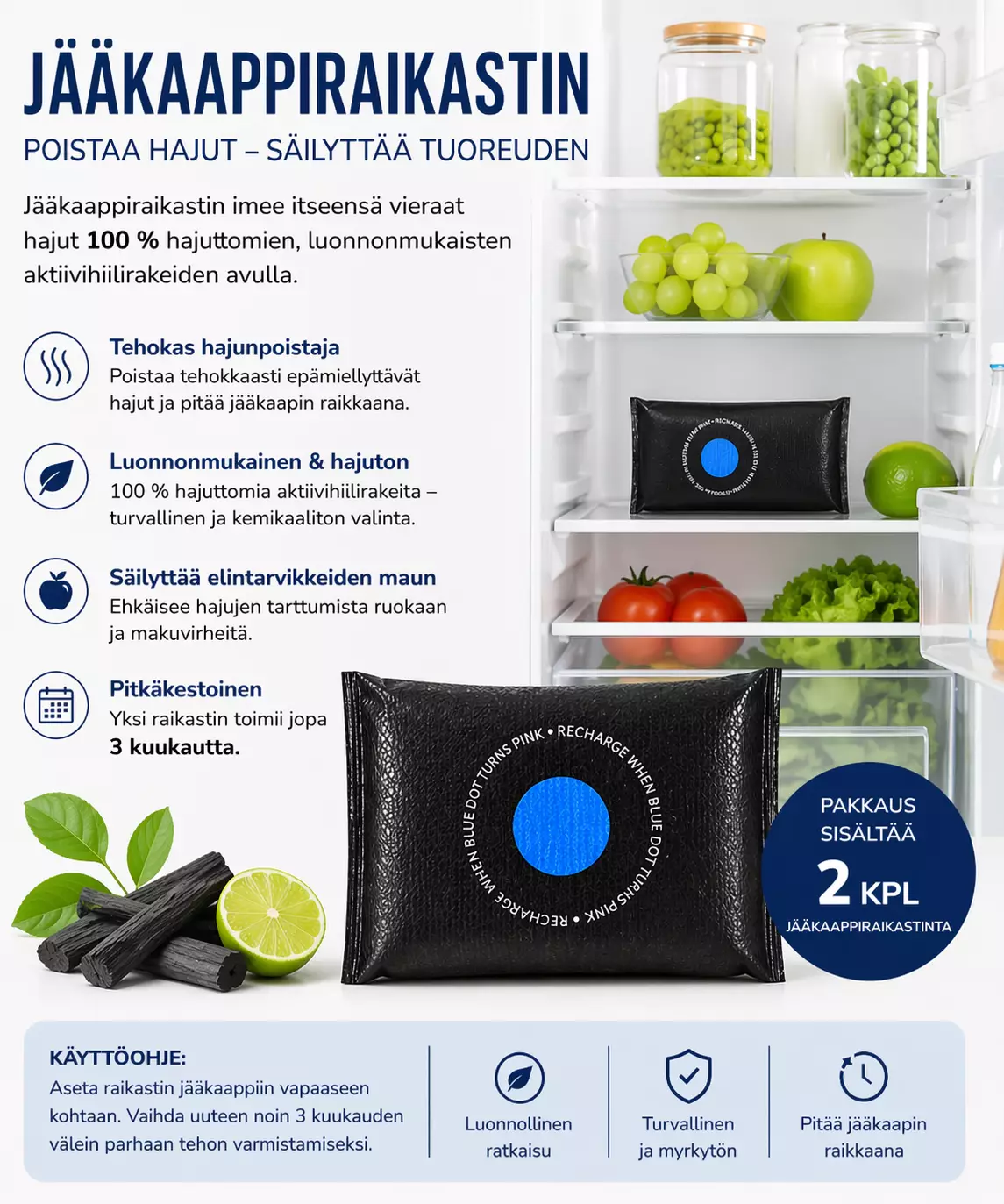 JÄÄKAAPPIRAIKASTINPoistaa hajut – säilyttää tuoreudenJääkaappiraikastin imee itseensä vieraat hajut 100 % hajuttomien, luonnonmukaisten aktiivihiilirakeiden avulla.Tehokas hajunpoistajaPoistaa tehokkaasti epämiellyttävät hajut ja pitää jääkaapin raikkaana.Luonnonmukainen & hajuton100 % hajuttomia aktiivihiilirakeita – turvallinen ja kemikaaliton valinta.Säilyttää elintarvikkeiden maunEhkäisee hajujen tarttumista ruokaan ja makuvirheitä.PitkäkestoinenYksi raikastin toimii jopa 3 kuukautta.PAKKAUS SISÄLTÄÄ2 kpl jääkaappiraikastintaKÄYTTÖOHJEAseta raikastin jääkaappiin vapaaseen kohtaan. Vaihda uuteen noin 3 kuukauden välein parhaan tehon varmistamiseksi.Luonnollinen ratkaisuTurvallinen ja myrkytönPitää jääkaapin raikkaana