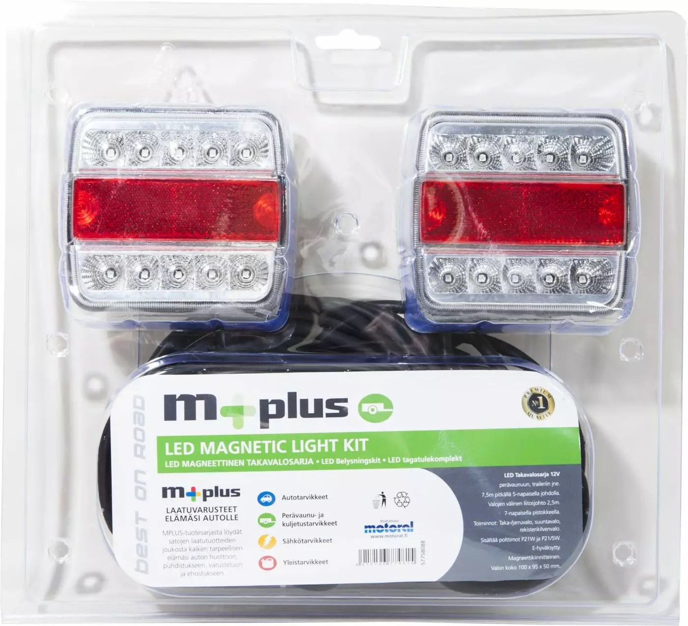 LED takavalosarja 12V perävaunuun, traileriin jne. 7,5m pitkällä 5-napaisella johdolla. Valojen välinen liitosjohto 2,5m. 7-napaisella pistokkeella. Toiminnot: Taka-/jarruvalo, suuntavalo, rekisterikilvenvalo. Sisältää polttimot P21W ja P21/5W. E-hyväksytty. Magneettikiinnitteinen. Valon koko 100 x 95 x 50 mm.