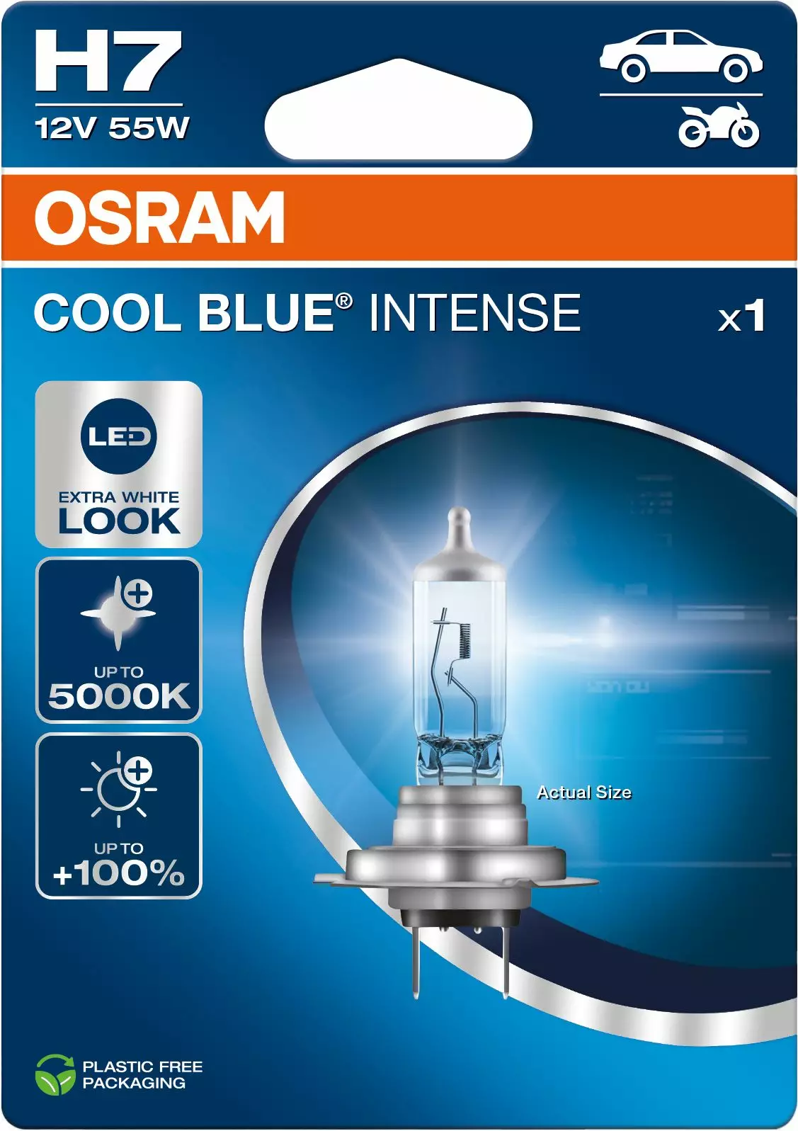 Vakiohalogeenilamppuihin verrattuna 100 % suurempi kirkkaus ja jopa 5000 K värilämpötila tarkoittavat, että kyseessä on äärimmäisen moderni LED look polttimo kauniilla valkoisella valolla. Sen sinertävä, kirkas valkoinen valo tuottaa ksenon-lamppuja muistuttavan vaikutelman. OSRAM COOL BLUE INTENSE -halogeenilamput ovat ECE-yhteensopivia ja saatavissa kaikkiin ajovaloihin. Optimoidun muotoilun ja hopeakupolin ansiosta mallit H7, H4, H11 ja HB3 sopivat myös käytettäviksi kirkaslasisissa ajovaloissa