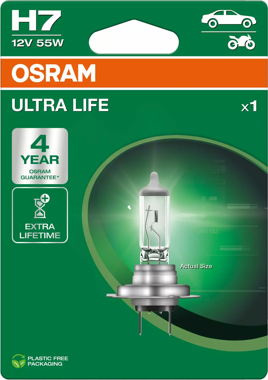 OSRAM ULTRA LIFE -halogeenipolttimoiden kestävyys ja luotettavuus on huippuluokkaa. Niiden elinikä on jopa neljä kertaa pidempi kuin tavanomaisilla halogeenipolttimoilla ja ne kestävät jopa 100 000 km. Osram antaa 4 vuoden takuun luotettaville ULTRA LIFE -polttimoille (neljäs vuosi verkkorekisteröinnillä, www.osram.com/am-guarantee).