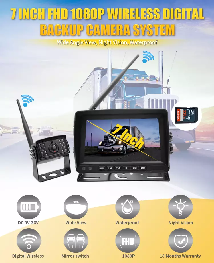 Muuta tietoa: 7" IPS FHD 1080P teräväpiirtonäyttö 2,4 GHz AI BSD digitaalinen langaton kamerajärjestelmä 12V / 24V / 36V laaja jännitealue, sopii useimpiin ajoneuvoihin 150° laajakulmanäkymä Tukee enintään 256 GB SD-korttia Yli 500 m signaalin siirto avoimessa ympäristössä IP68-vesitiivis ja pölytiivis langaton kamera Yönäkö 18 IR-ledillä 7" näyttö: 180 × 50 × 110 mm Kamera: 80 × 50 × 54 mm HUOM! vain tiedonsiirto langaton. Tarvitsee virran autosta tai kärrystä.