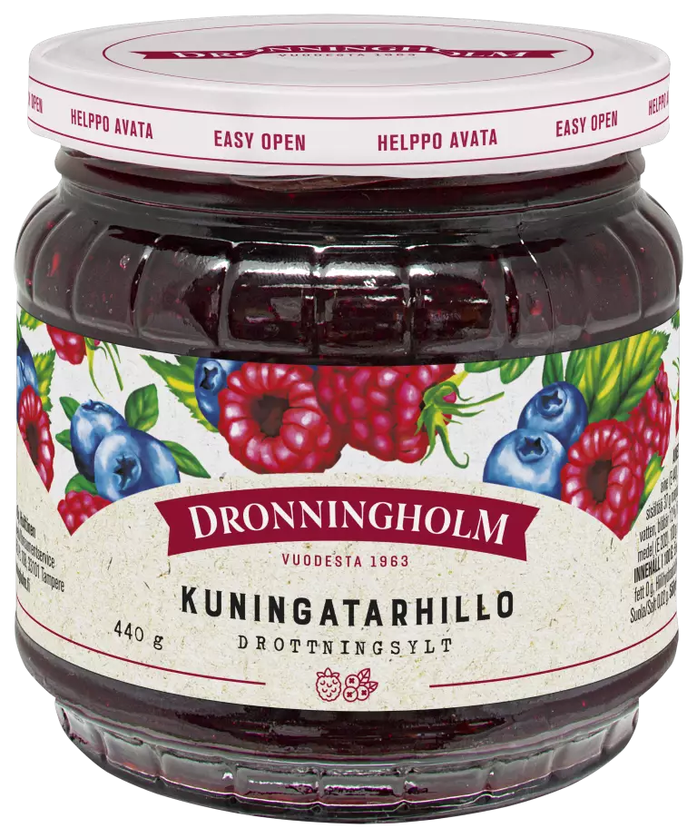 Huolella ja rakkaudella valmistamamme Kuningatarhillo on hillomaailman aatelia herkullisimmillaan, jossa vadelman pehmeä hapokkuus ja mustikan marjaisa makeus kruunavat herkkuhetkesi. Vegaaninen. Sopii vegaaneille. Dronningholm - siinä on marjat!