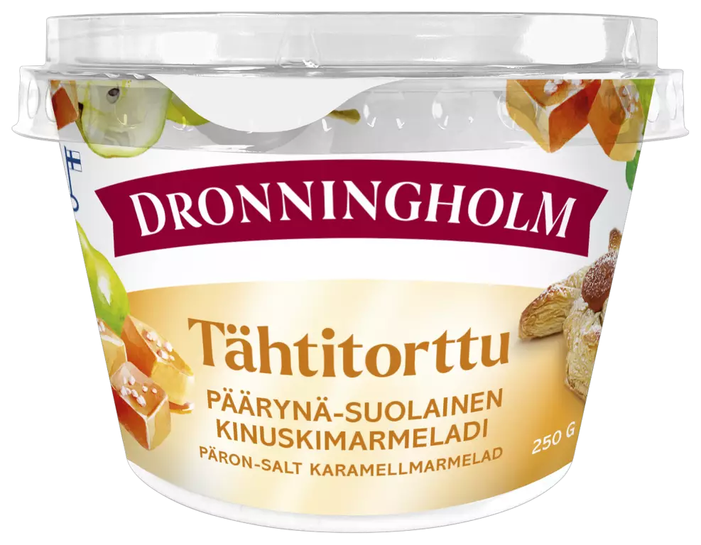 Tähtitorttu-marmeladit ovat huolella ja rakkaudella valmistettuja paistonkestäviä marmeladeja. Päärynä-suolainen kinuskimarmeladi on trendikäs ja herkullinen vaihtoehto syksyn ja joulun leivontaan. Purkista riittää noin kahdellekymmenelle joulutortulle täytettä, 12,5 g/kpl. Vegaaninen. Sopii vegaaneille. Dronningholm - siinä on marjat!