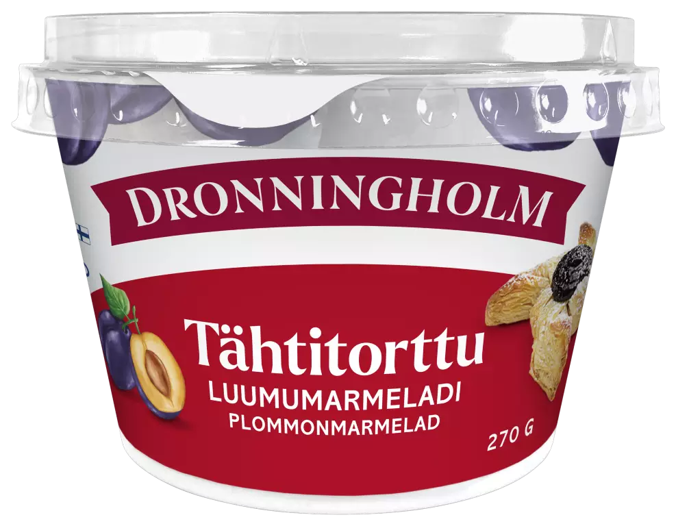 Tähtitorttu-marmeladit ovat huolella ja rakkaudella valmistettuja paistonkestäviä marmeladeja. Luumumarmeladimme on tunnettu ja perinteinen joulunajan leivontamarmeladi, josta riittää täytettä noin kahdellekymmenelle joulutortulle, 13,5g/kpl. Tuote sopii myös jälkiruokiin. Vegaaninen. Sopii vegaaneille. Dronningholm - siinä on marjat!