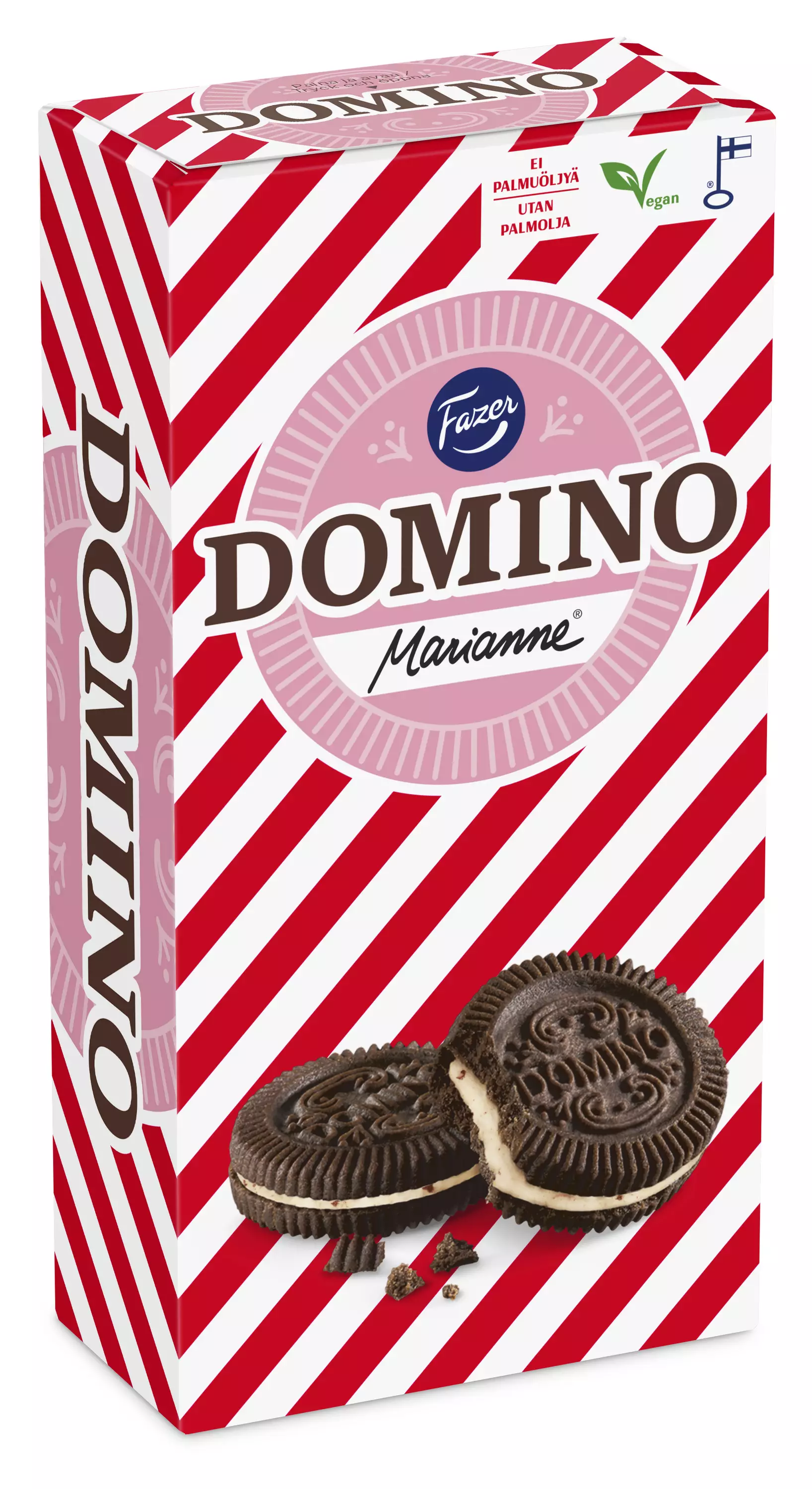 Domino on suosikkikeksi, jonka yhteinen taival suomalaisten kanssa on jatkunut jo vuodesta 1953. Domino Marianne -täytekeksissä kohtaavat kaksi todellista klassikkoa: herkullinen tumma Domino-kaakaokeksi sekä Marianne-piparmintturouheen piristämä vaalea täyte. Noudatamme kaakaonhankinnassamme Fazerin kaakaovisiota. Lue lisää www.fazercocoavision.com. Tarjoa maistuvia Domino Marianne -keksejä kahvipöydässä ja nautiskele arjessa ja juhlassa. Domino Marianne -keksit sopivat myös vegaaneille.