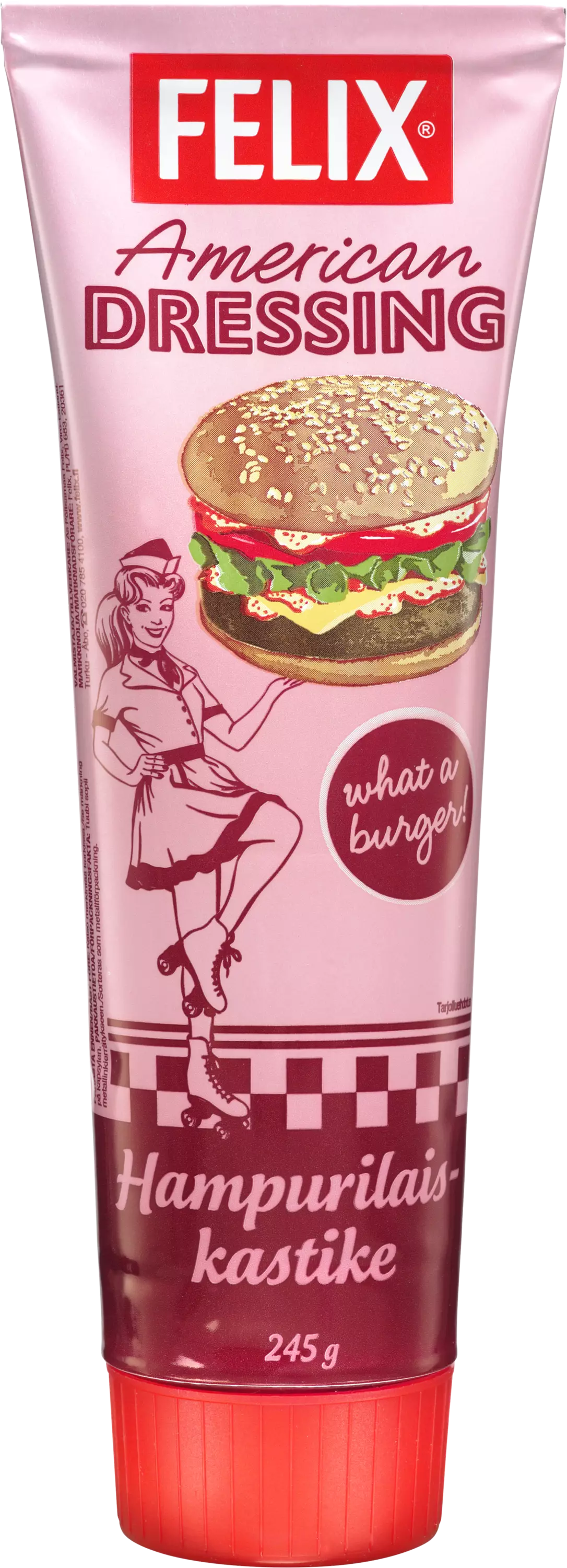 Felix® American Dressing on hampurilaiskastikkeiden klassikko, todellinen kestosuosikki. Tuubillinen aitoa Amerikan meininkiä täydentää perinteisen hampurilaisen, maku on täyteläisen pehmeä ja sopivasti mausteinen. Maku, josta pitävät kaikki. Kokeile rohkeasti esimerkiksi grillatun kanan tai kasvisten kaverina, American Dressing maistuu myös sellaisenaan voileivän päällä. Tuubista on helppo ja kätevä annostella, ei suttaa! Nappaa herkulliset street food -reseptit osoitteesta felix.fi. Felix - Herkkuja ruokapöytään®.