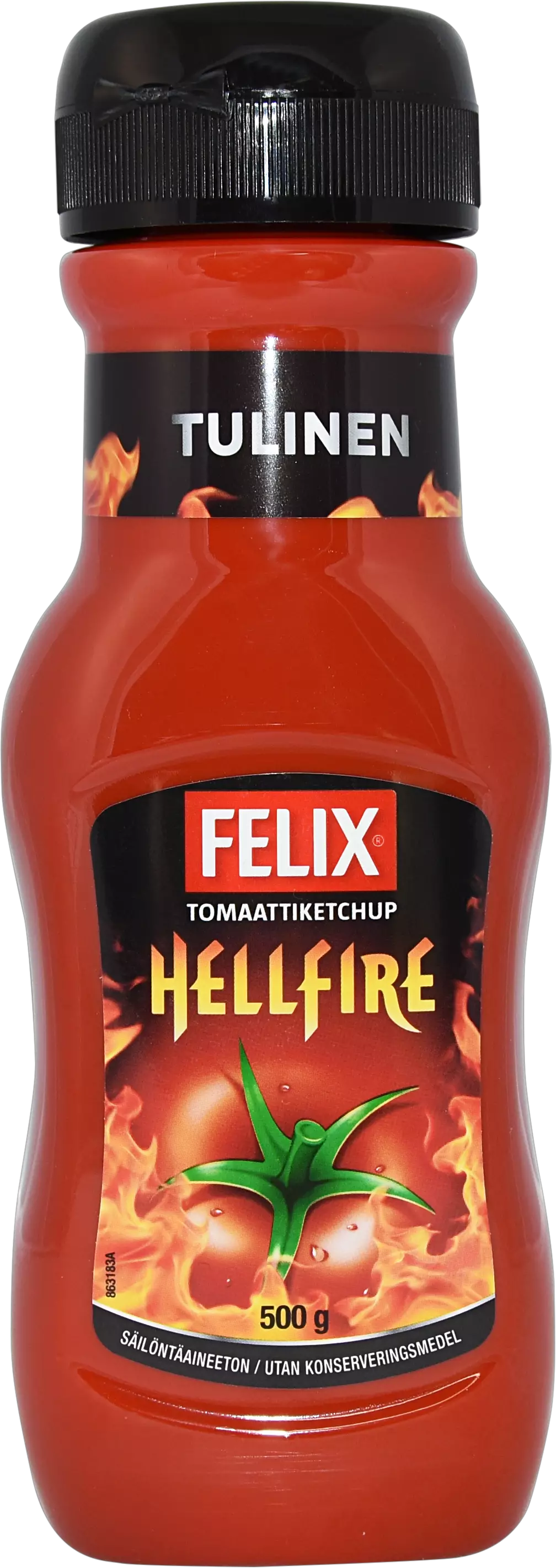 Felix® Hellfire Ketchup on ketsuppi todella tulisen maun ystäville. Tulinen ja voimakas maku on saatu maustamalla auringon kypsyttämistä tomaateista valmistettu ketsuppi mm. cayennepippurilla, chililllä, mustapippurilla ja valkosipulilla. Tämä ketsuppi ei jätä ketään kylmäksi. Itse asiassa, Felix Hellfire Ketchup vastaa tulisuudeltaan useita chilikastikkeita, mutta on samalla maistuva ja aromikas. Felix Ketchup on vastuullinen valinta, olemme pyrkineet minimoimaan tuotteen valmistuksesta aiheutuvat hiilidioksidipäästöt. Lisäksi tuote on säilöntäaineeton. Lue lisää felix.fi. Felix - herkkuja ruokapöytään®.