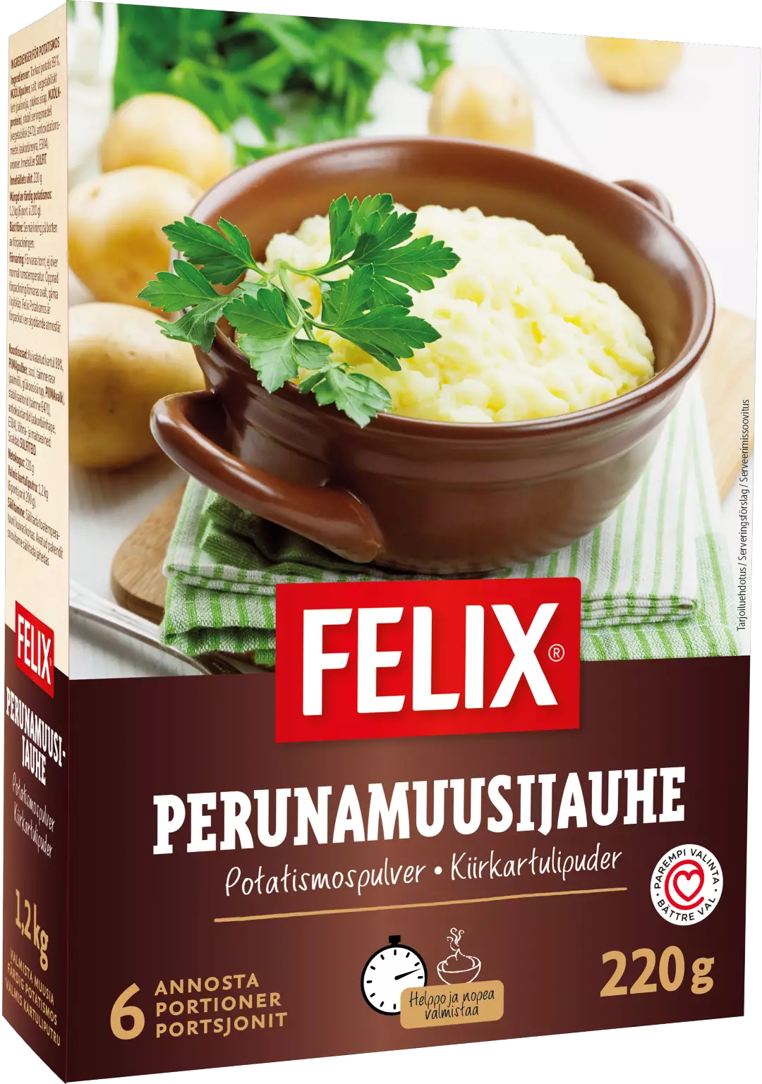 Felix® Perunamuusijauhe on helppo ja nopea apuri ruuanlaitossa. Perunamuusijauheesta syntyy pehmeän makuista muusia esimerkiksi lihapullien lisukkeeksi. Mausta muusi yrteillä, valkosipulilla tai vaikka Felix piparjuuritahnalla, niin saat lisämakua. Felix Perunamuusijauhe on erinomainen raaka-aine ruokaisiin piirakkapohjiin tai keittojen sakeuttamiseen. Perunamuusijauheesta saat valmistettua myös maistuvan perunalaatikon, esimerkiksi joulupöytään. Tuote sopii laktovegetaariseen ja gluteenittomaan ruokavalioon. Lue lisää felix.fi. Felix - herkkuja ruokapöytään®