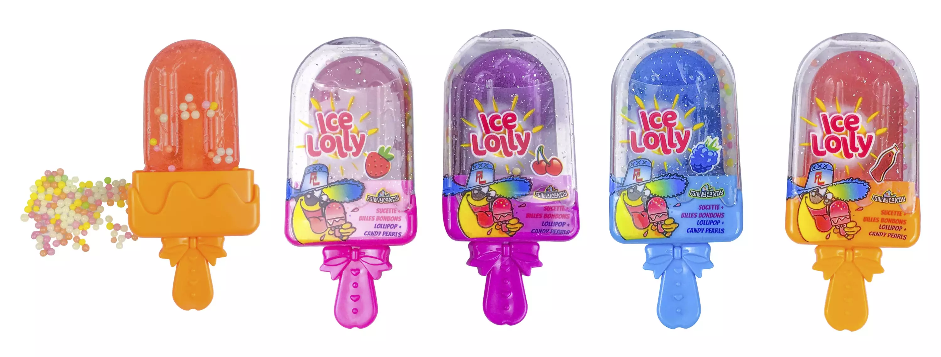Hauska mehujään muotoinen tikkari värikkäillä karkkihelmillä! Makuina mansikka, vadelma, cola ja kirsikka.