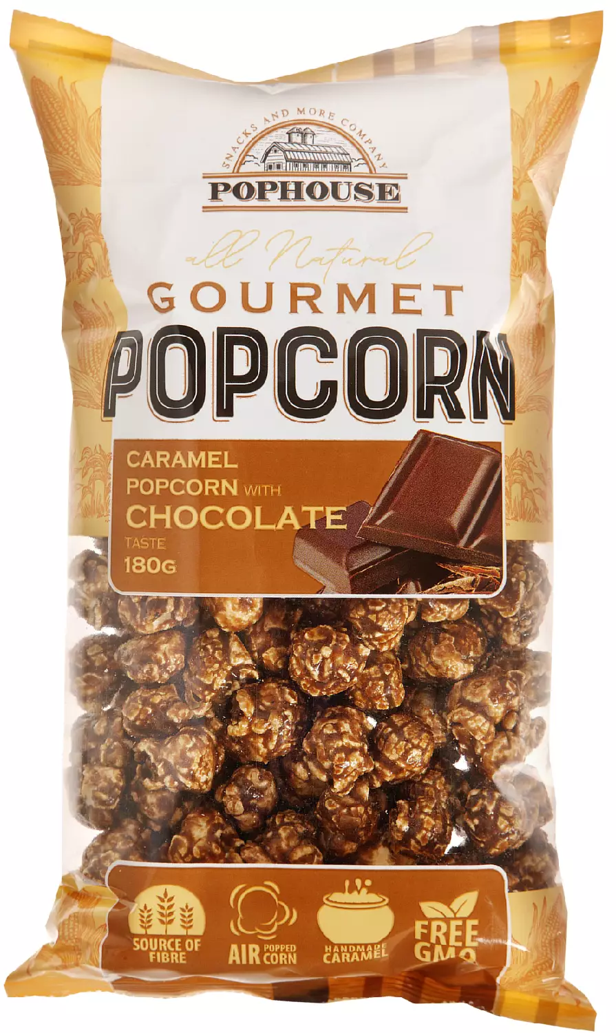 Suklaanmakuinen toffee popcorni. Varoitus: Tuote saattaa sisältää kovia maissinpaloja, seesaminsiemeniä, maapähkinöitä ja muita pähkinän paloja. Säilytä kuivassa ja viileässä paikassa poissa suorasta auringonvalosta. Säilytä avattu tuote suljetussa astiassa.