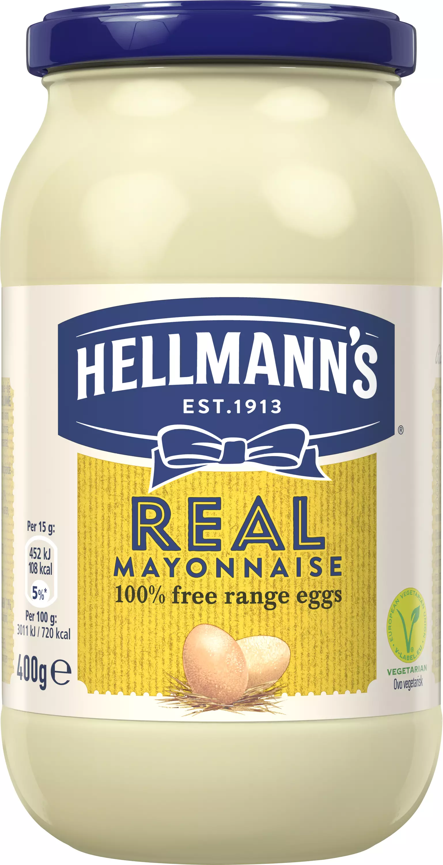 Hellmann's-majoneesi tunnetaan yksinkertaisista ja laadukkaista raaka-aineista, jotka antavat majoneesiin pehmeän kermaisen maun. Hellmann's Real -majoneesi on amerikkalainen klassikko, joka on valmistettu käyttäen vapaiden kanojen kananmunia. Yhdessä ainesosien, kuten rypsiöljyn, etikan ja sitruunan kanssa ne antavat majoneesille herkullisen koostumuksen ja vastustamattoman maun. Ei lisättyä sokeria.Maailman myydyin majoneesi sopii mainiosti kastikkeisiin ja salaatteihin, on herkullista hampurilaisen kanssa sekä omiaan täytettyihin voileipiin. Hellmann's Real -majoneesi käy mainiosti myös ruoanlaittoon ja leivontaan. Hellmann's Real -majoneesissa on runsaasti ravitsemissuositusten mukaisia omega-3-rasvahappoja ja tyydyttymättömiä rasvoja.Tämä ikoninen Hellmann's klassikkomajoneesi on nyt saatavana 400 gramman ja 200 gramman purkeissa. Kokeile rohkeasti myös muita makujamme, Hellmann'sin maustettua majoneesia Hellmann's Chiliä tai Hellmann's Vegan Mayo -vegaanimajoneesia. Hellmann's-majoneesi on tehty sinulle, joka haluat nauttia hyvästä ruoasta. Richard Hellmann avasi herkkupuodin New Yorkiin vuonna 1905 ja alkoi myydä siellä omaa majoneesiaan. Resepti oli hänen vaimonsa käsialaa. Hellmann viimeisteli majoneesipurkit solmimalla siniset rusetit niiden ympärille. Majoneesi sai suuren suosion ja rusetista tuli osa Hellmann'sin tuotemerkkiä eli logoa.Me Hellmann’silla rakastamme ruokaa. Uskomme, että hyvä ruoka syntyy parhaista raaka-aineista. Siksi olemme päättäneet valmistaa tuotteemme niin yksinkertaisista ja luonnollisista raaka-aineista kuin mahdollista, kuten vapaiden ja ulkoilevien kanojen munista. Pyrimme käyttämään mahdollisimman pitkälti kestävän kehityksen periaatteiden mukaisia raaka-aineita. Lisäksi etsimme aina uusia tapoja minimoida ympäristövaikutustamme.Ruoka maistuu herkulliselta Hellmann’s majoneesin kanssa. Mutta tiesitkö, että voit käyttää tuotteitamme myös ruoanvalmistuksessa ja leivonnassa? Hellmann’sin tuotteilla saat uudenlaisia jännittäviä makuja alkupaloihin, pääruokiin, leivonnaisiin ja lisukkeisiin. Ei ihme, että Hellmann's on maailman suosituin majoneesi!