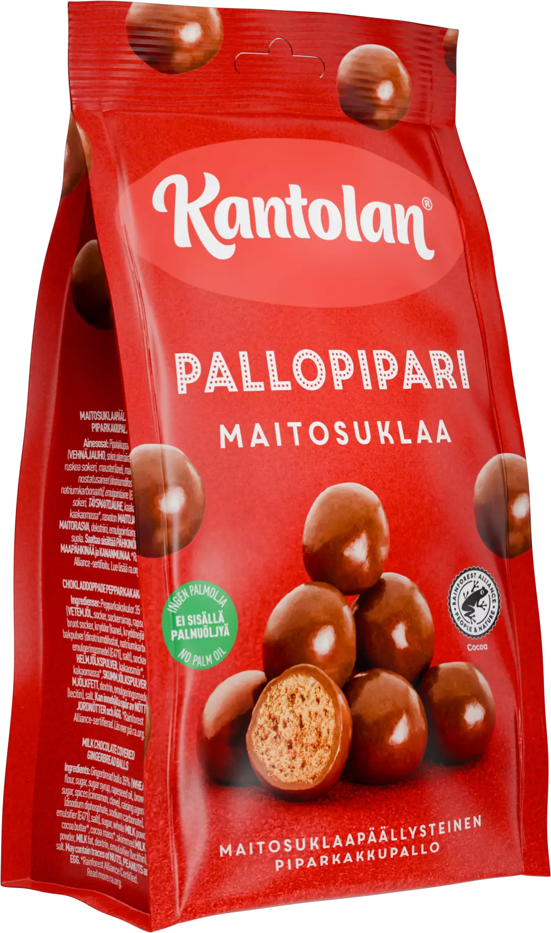 Kantolan leipoi piparit pyöreäksi ja valmisti herkullisella maitosuklaalla päällystettyjä rapeita piparipalloja. Tuote on valmistettu Rainforest Alliance-sertifioidusta suklaasta. Palmuöljytön.