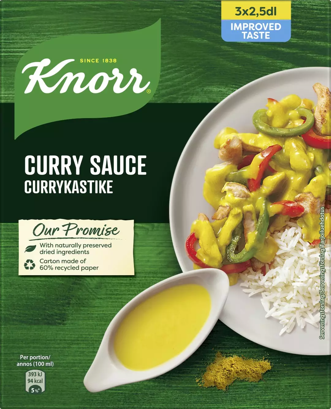 Knorr Kastikeaines Currykastike on mieto currykastike, mikä sopii hyvin kanan ja riisin kanssa, mutta sitä voit makusi mukaan käyttää mainiosti myös kasvisruokiin. Kastike on valmistettu luonnollisesti ilman säilöntäaineita, ilman aromivahventeita ja ilman lisättyjä väriaineita.Knorr Kastikeainekset sisältää kolme kastikeainespussia. Knorr Kastikeainesten joukosta löydät aina oikean Knorr-kastikkeen, joka täydentää parhaiten ruokasi ainutlaatuista makua. Meiltä saat tutut kastikkeet, kuten Bearnaisekastikkeen, herkkusienikastikkeen ja punaviinikastikkeen. Kaikki Knorr-kastikkeet ovat yhtä vaivattomia valmistaa ja vievät vain hetken aikaan. Laadukas ja maukas ruoka on intohimomme! Siksi Knorr pyrkii aina kehittämään uusia, herkullisia ja jännittäviä ruokatuotteita. Yksi vahvimmista puolistamme on laaja tuntemus paikallisista ruokaperinteistä – huolimatta siitä, että olemme niin suuri kansainvälinen brändi. Meitä ohjaa rakkaus ruokaan. Olemme tehneet Knorrilla vuosikymmenten ajan työtä luodaksemme korkealaatuisia tuotteita, jotka valmistetaan parhaista raaka-aineista. Autamme sinua valmistamaan hyvää, yksinkertaista ja terveellistä ruokaa, jossa on runsaasti makua. Intohimo laadukkaaseen ja maukkaaseen ruokaan vie meidät tulevaisuuteen, joka huomioi paremmin yhteiskuntamme ja ympäristömme. Tulevaisuuteen, jossa kaikki raaka-aineemme vihanneksista alkaen ovat kestävästi tuotettuja. Me Knorrilla haluamme uudistaa ruokailutottumuksia, mutta emme pysty siihen yksin. Kutsumme sinut mukaan. Rakennetaan yhdessä vihreämpää tulevaisuutta. Vieraile verkkosivuillamme knorr.com/fi nähdäksesi tuotteemme ja reseptimme. Tutustu kaikkeen siihen, mikä meitä inspiroi kestävän tulevaisuuden luomiseen.