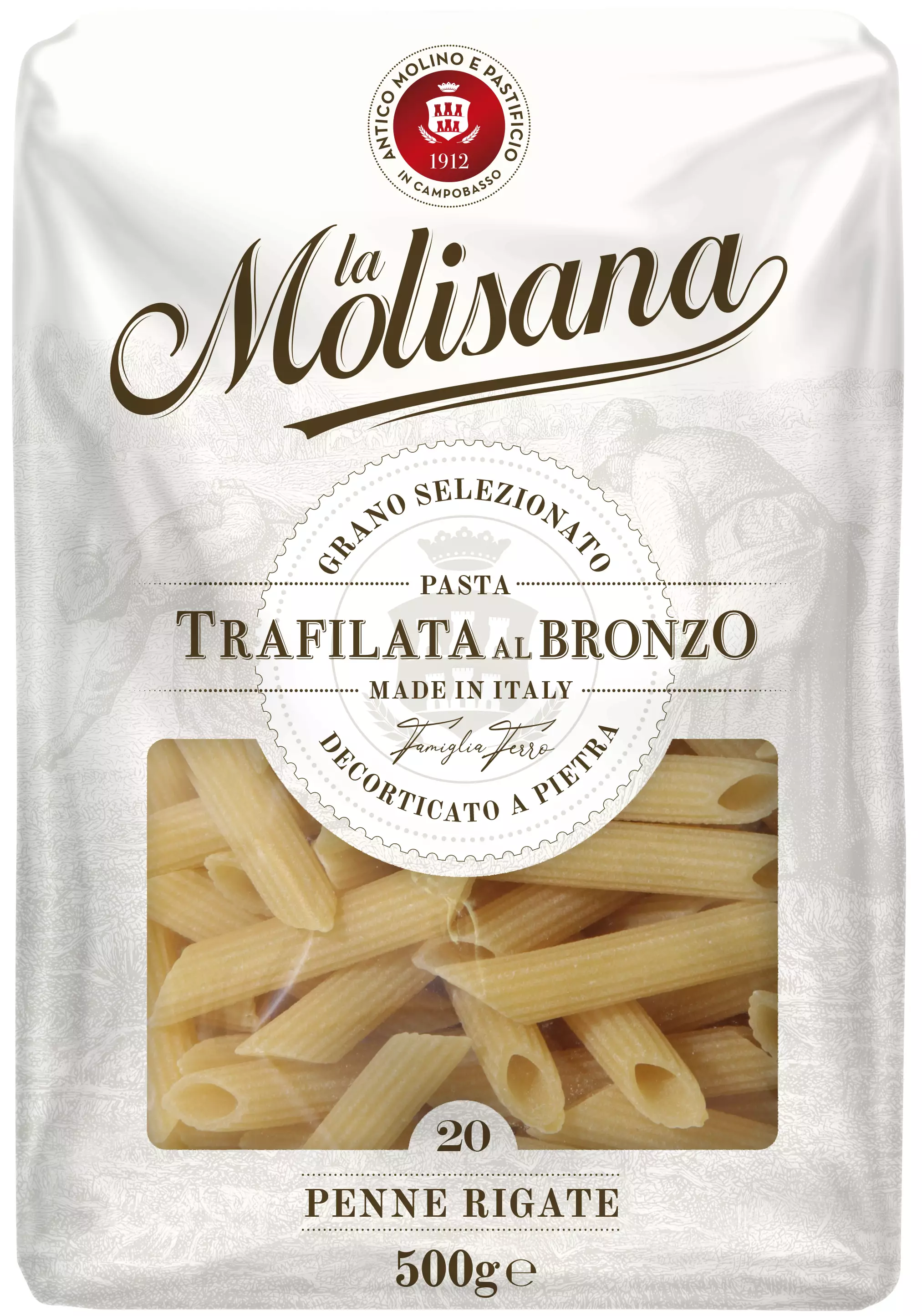 Aito italialainen durumpasta. Laadukkaan La Molisana pastan korkea gluteenipitoisuus takaa, että pasta kestää hyvin keittämistä ja se on aina ”al dente”. La Molisana pastan valmistukseen on käytetty tarkoin valikoitua viljaa ja raikasta vuoristovettä. La Molisana pasta valmistetaan pronssisilla valumuoteilla, jotka tekevät pastaan karhean pinnan – tämä parantaa kastikkeiden tarttumista pastan pintaan ja pasta maistuu entistäkin paremmalta. La Molisana penne rigate sopii hyvin esim. uunipastan valmistukseen. Maista ja nauti.