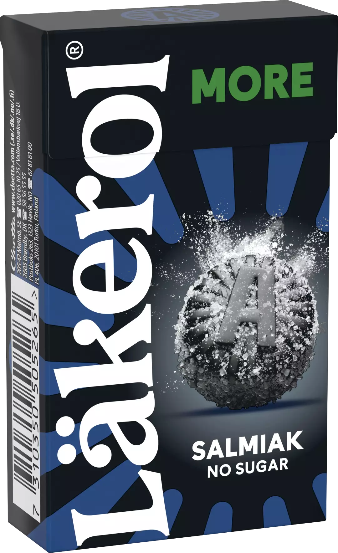 Läkerol More Salmiak sokeriton tarjoaa enemmän makua ja kokoa sekä pehmeän pureskeltavaa rakennetta. Intensiivistä salmiakin makua korostaa kidepäällyste. Kätevä pikkurasia on helppo ottaa mukaan taltuttamaan pieni salmiakinhimo.