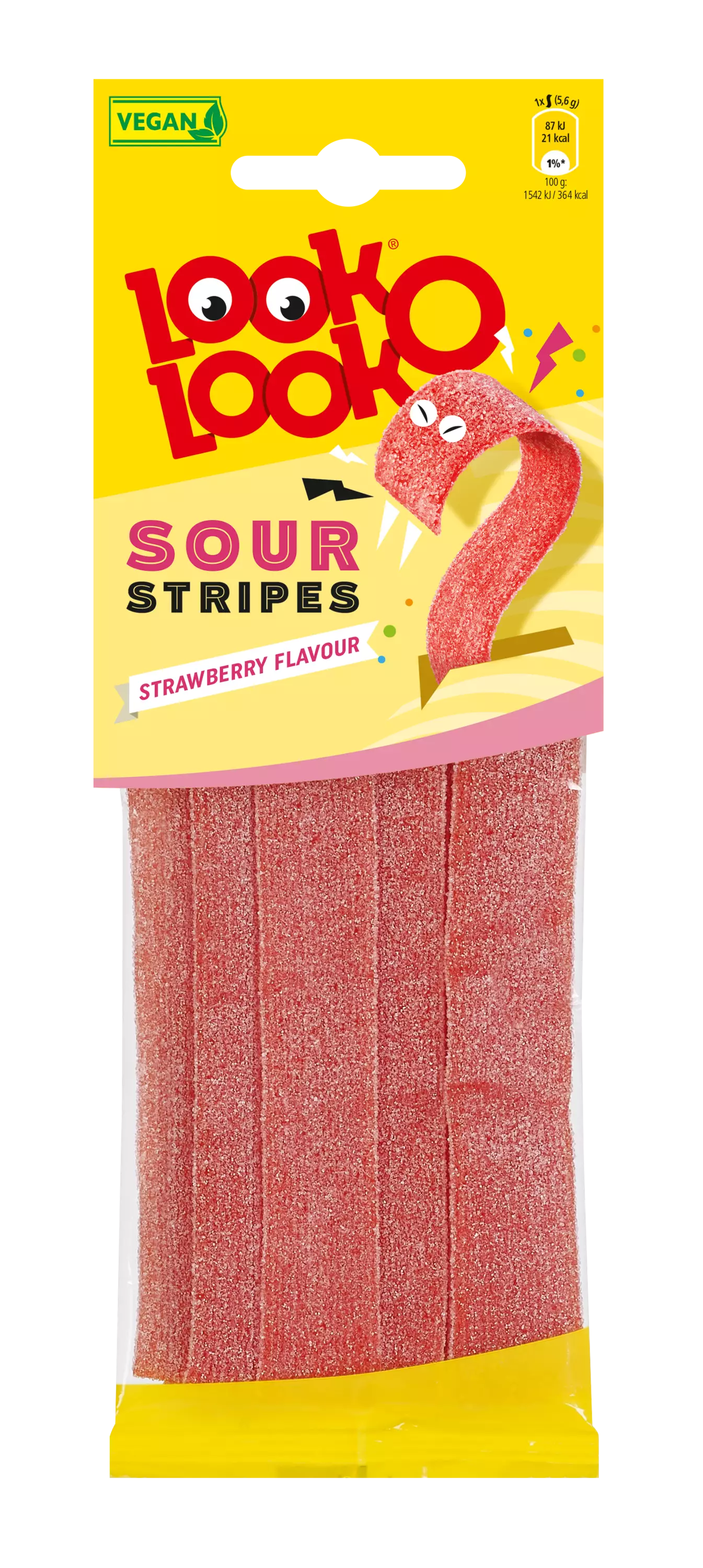 Look-O-Look perheen uusin tulokas Sour Stripes Strawberry on herkullisen kirpeä mansikanmakuinen makeisnauha. Pakkaus sisältää makeisnauhoja 16 kappaletta.
