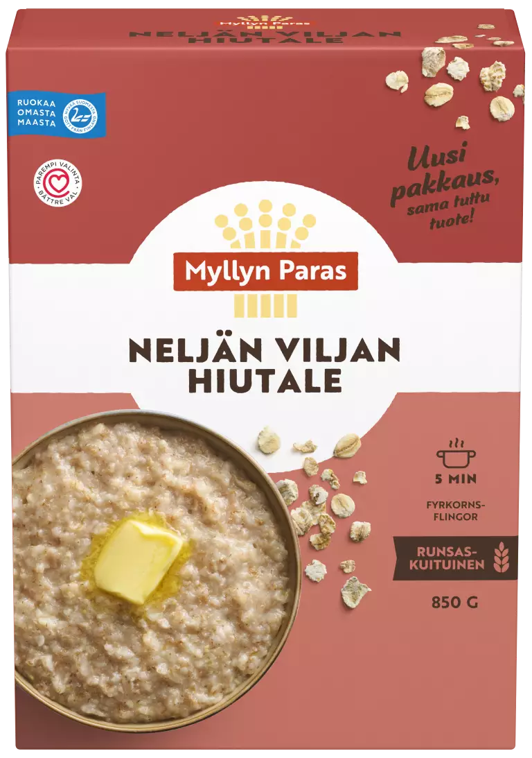 Myllyn Paras Neljän Viljan Hiutaleet valmistetaan rukiin-, vehnän-, kauran- ja ohranjyvistä, jotka esikypsytetään, leikataan ja litistetään hiutaleiksi. Ne sopivat puuroihin, leivontaan, mysleihin sekä sellaisenaan nautittavaksi esim. viilin tai jogurtin kanssa.