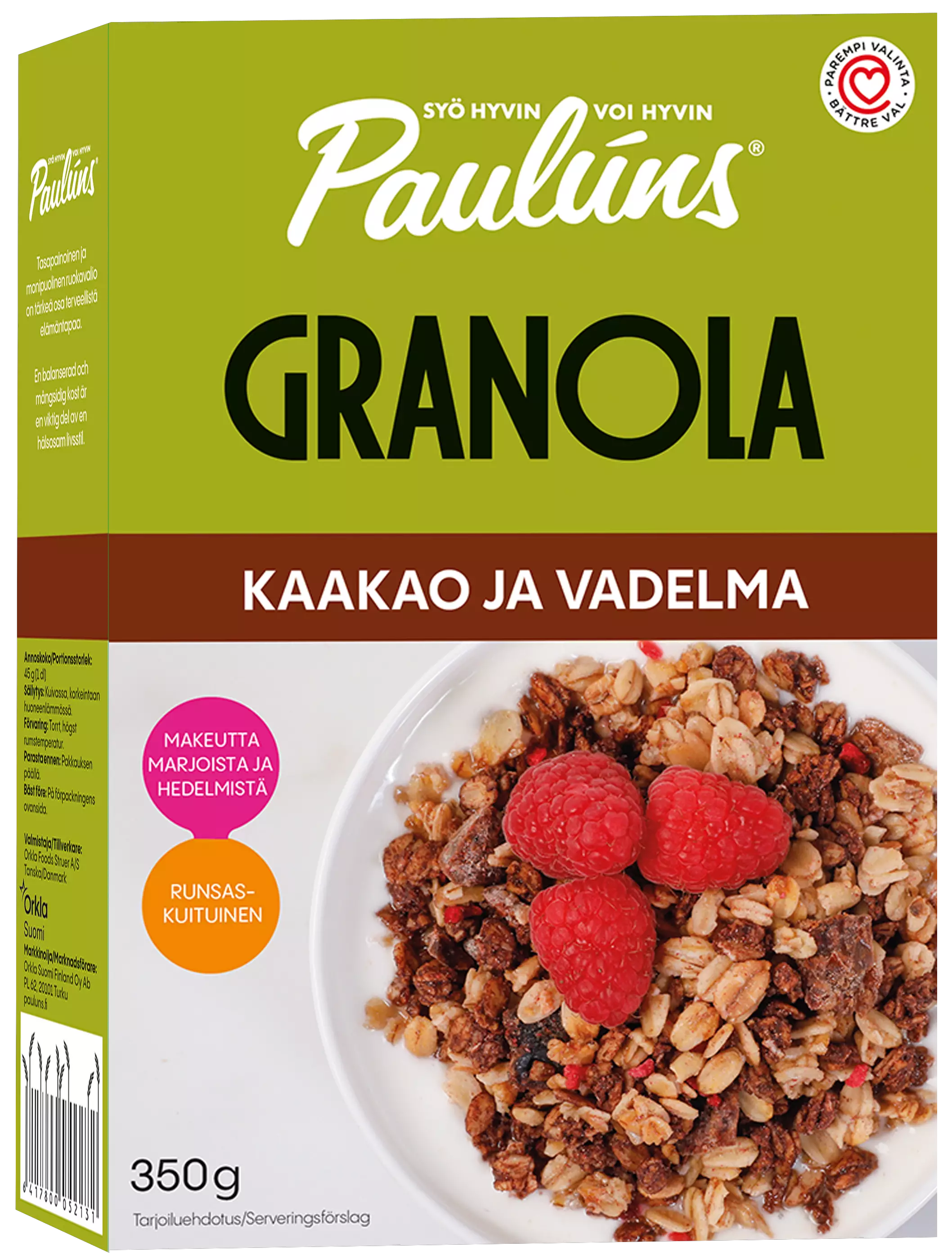 Paulúns® Granola kaakao ja vadelma on paahdettu, kaakaolla maustettu muromysli. Tässä granolassa on rapean täysjyväviljan mukana taatelia ja vadelmaa. Lisäksi Paulúns Granola sisältää luontaisesti kivennäisaineita ja vitamiineja ja se on siksi terveellinen aamupala. Nauti sellaisenaan esim. maustamattoman jogurtin kanssa. Hyvä idea on myös lisätä granolaa raaka-aineeksi hedelmäiseen tai marjaisaan smoothie bowliin. Paulúns - syö hyvin, voi hyvin®. Paulúns-tuotteet saavat makeutta marjoista ja hedelmistä, aina ilman lisäaineita. Nauti osana terveellistä ruokavaliota ja elämäntapaa. Tuotteelle on myönnetty tuoteryhmässään terveellisemmästä vaihtoehdosta kertova Sydänmerkki.