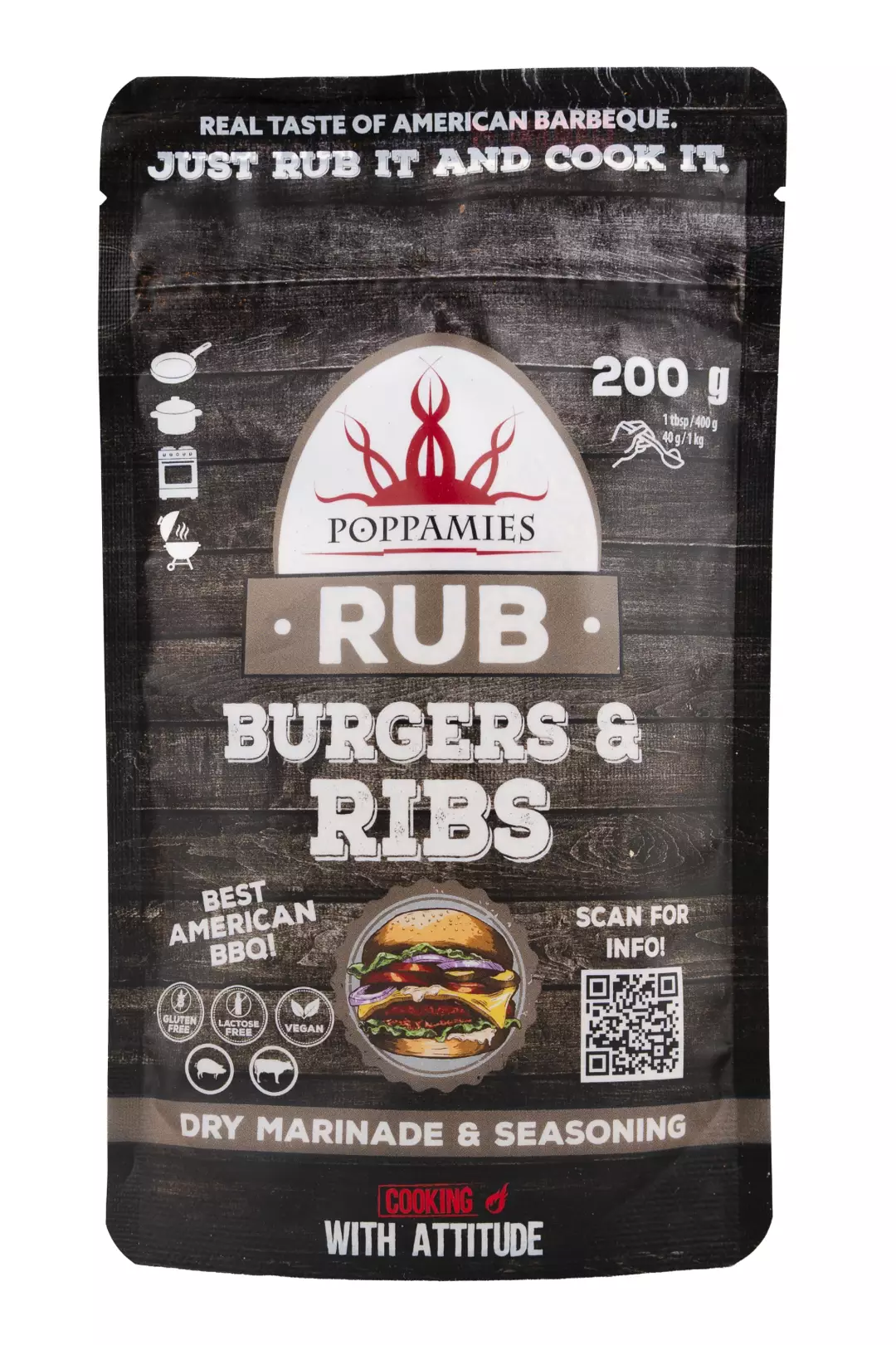 Amerikkalaistyylinen, savuinen ja sopivan makea mausteseos! Poppamies Burgers & Ribs Rub on legendaarinen, erityisen hyvin amerikkalaistyylisille grilliruoille sopiva, mukavan savuinen ja makea kuivamarinointimausteseos. Käytä mausteseosta ribsien ja hampurilaispihvien maustamiseen sekä kaikelle grilliruoalle! Mausteseos sopii erityisen hyvin possulle, naudalle ja kanalle. Mausteseos on kehitetty kuivamarinointiin, eli raaka-aineeseen hierottavaksi, mutta sitä voi käyttää ruoanlaitossa myös perinteisen mausteseoksen tapaan. Kokeile esimerkiksi kastikkeisiin ja keittoihin! Hiero mausteseosta ribsien pintaan ennen kypsennystä tai pintamausta hampurilaispihvit ennen pihvien muotoilua. Gluteeniton, laktoositon, vegaaninen.