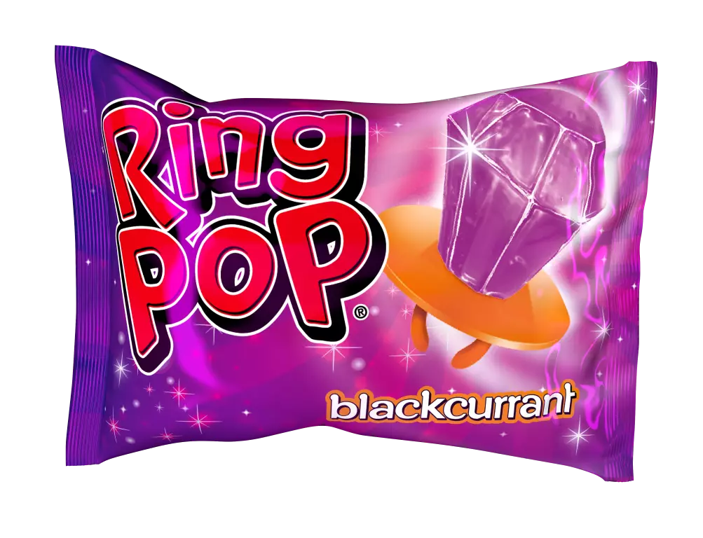Ring Pop makeinen hurmaa jalokiven muotoisella designillaan! Neljä erilaista makua: mansikka, mustaherukka, cola ja vadelma.