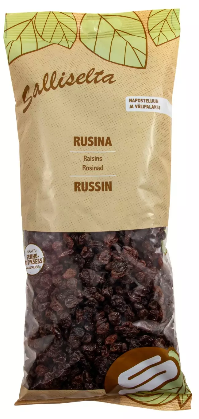 Rusinat ovat kuivattuja viinirypäleitä. Rusinoita voi nauttia ihan sellaisenaan tai lisätä aamupuuroon tai jugurttiin. Rusinat sopivat myös leivontaan ja jälkiruokiin sekä ruuanlaittoon. Vappuna rusinat maustavat simaa ja jouluna niitä nautitaan manteleiden kanssa glögin joukossa tai suoraan kiposta napostellen. Salliselta tuotteet pakataan Suomessa.
