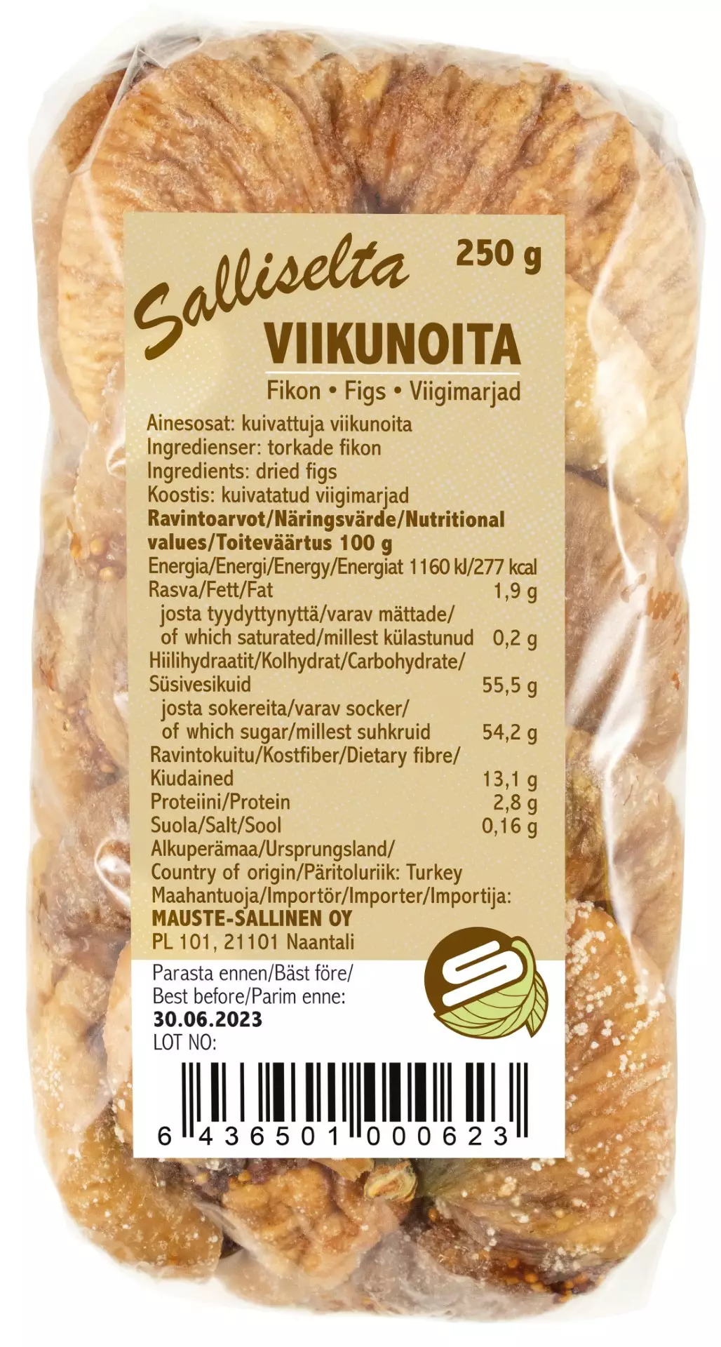 Viikunaa sanotaan maailman makeimmaksi hedelmäksi. Se on kuivattuna vielä makeampi kuin tuoreena ja kuivattu viikuna onkin suosittu korvike makeisille. Viikunaa voikin herkutella sellaisenaan, tai sitä voi käyttää tuomaan luonnollista makeutta leivonnaisiin. Kokeile viikunaa sinihomejuuston kanssa. Valmistuttaja Sallinen.