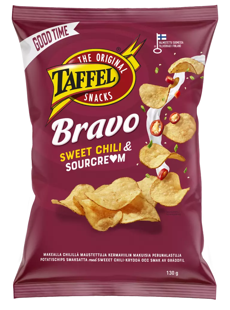 Hillittömän herkullisessa Taffel Bravossa makea chili yhdistyy kaikkien rakastamaan kermaviilin makuun – ja vieläpä vegaanisesti. Sipsi, joka saa makunystyrät taputtamaan seisaaltaan.