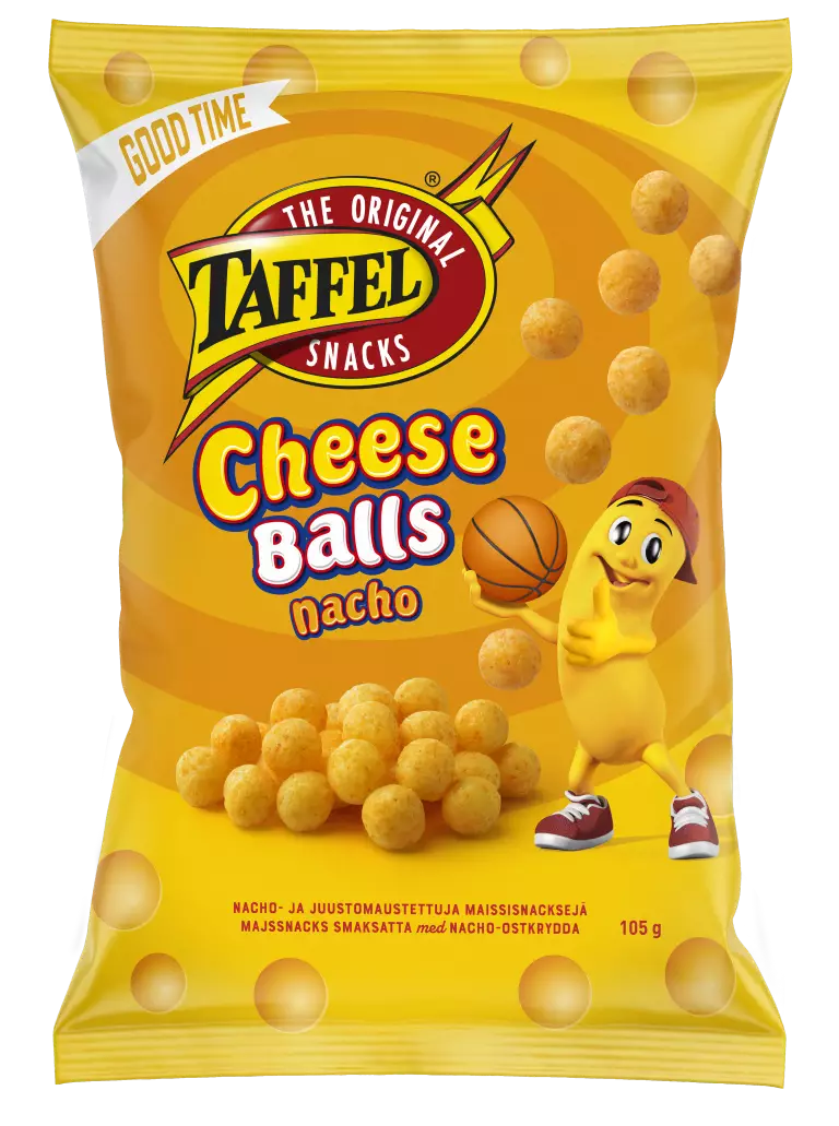 Rapea Taffel Cheese Balls Nacho on ihanan pyöreänmakuinen, aidossa nachomaustetussa juustossa pyöritelty maissiherkku. Tämä snacks on kuin naksu, joka on muodoltaan pallo.