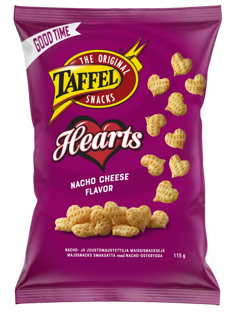 Herkullisen säväyttävät, nacho-juustolla maustetut superrapeat Taffel Heartsit saavat sinut varmasti näkemään sydämiä. Ole hyvä, ota sipsi!