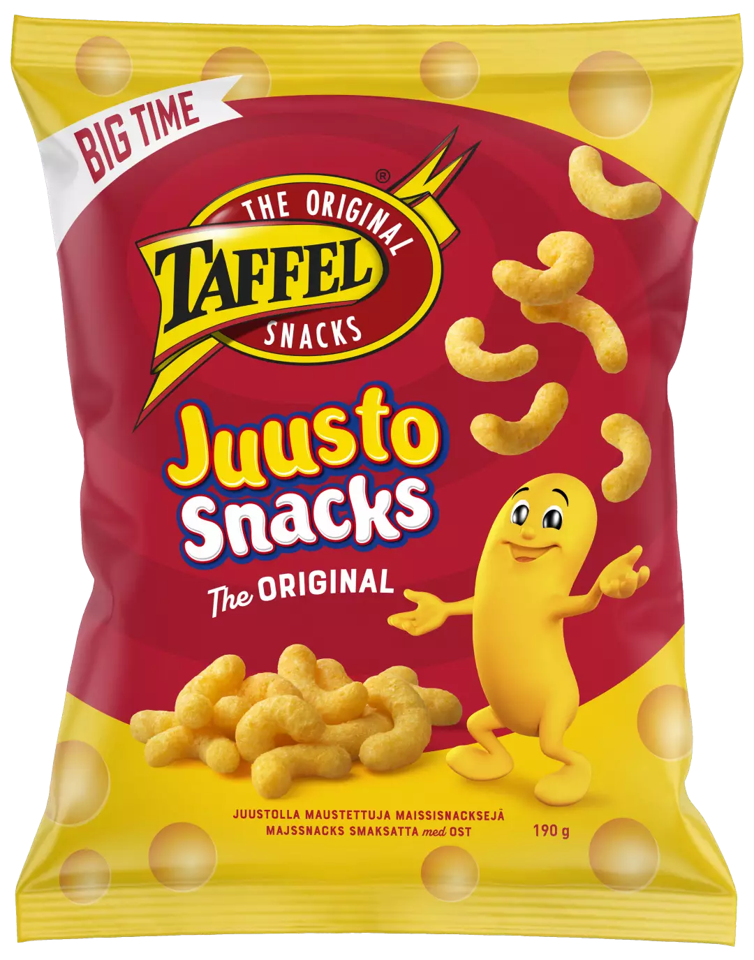 Ensimmäinen, aito, oikea juustosnacks on Taffel Juusto Snacks. Se on jo sukupolvien ajan, vuodesta 1986 koukuttanut aidolla cheddarjuustollaan ja herkullisella rapeudellaan.