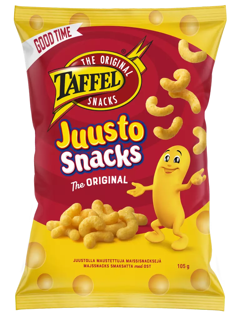 Ensimmäinen, aito, oikea juustosnacks on Taffel Juusto Snacks. Se on jo sukupolvien ajan, vuodesta 1986 koukuttanut aidolla cheddarjuustollaan ja herkullisella rapeudellaan.