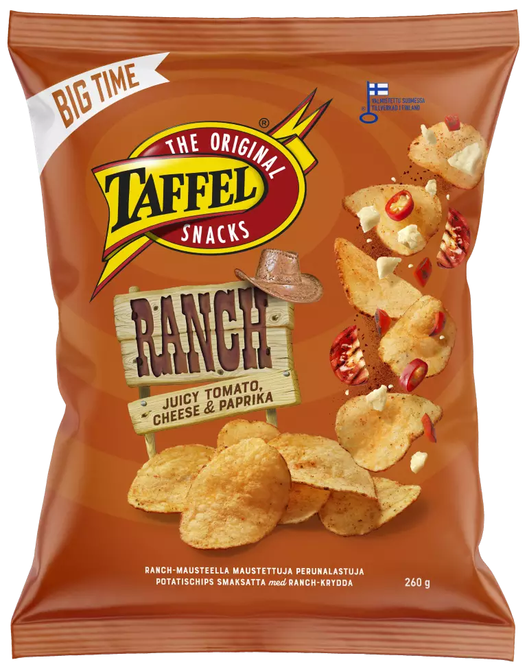 Kasviöljyssä paistetussa, rapeassa Taffel Ranchissä maistuvat tomaatti, kermainen juusto, paprika ja makea sipuli. Se on sipsi, jonka syöjälle on luvassa rapea makurodeo.