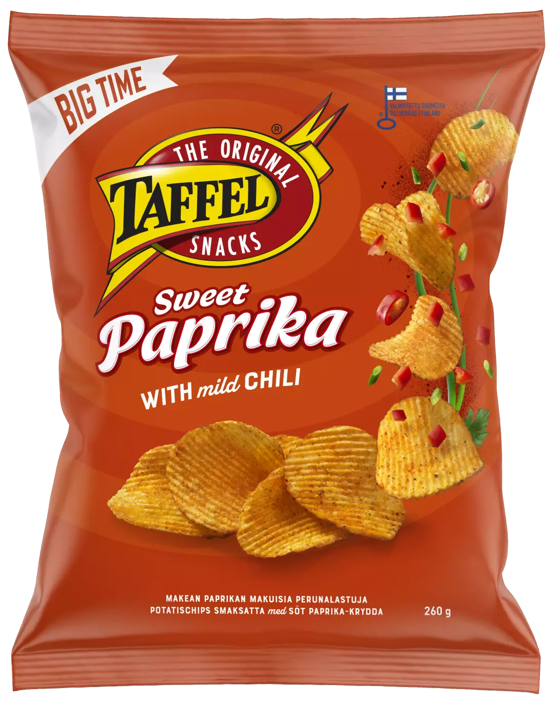 Taffel Sweet Paprikan makean paprikan ja miedon chilin lämpö saa makunystyrät väreilemään samanmuotoisena kuin nämä ihanat sipsit.