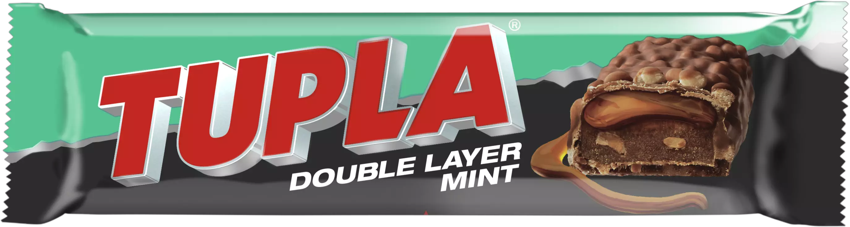 Rouheassa ja makeassa Tupla Double Layer Mint kerrospatukassa yhdistyvät suklaapatukan parhaat ominaisuudet: kaakaonougatin herkullisuus, minttutoffeekerroksen makeus sekä krispin rapeus. Patukka on kuorrutettu maitosuklaalla ja sisältää aina kaksi palaa.