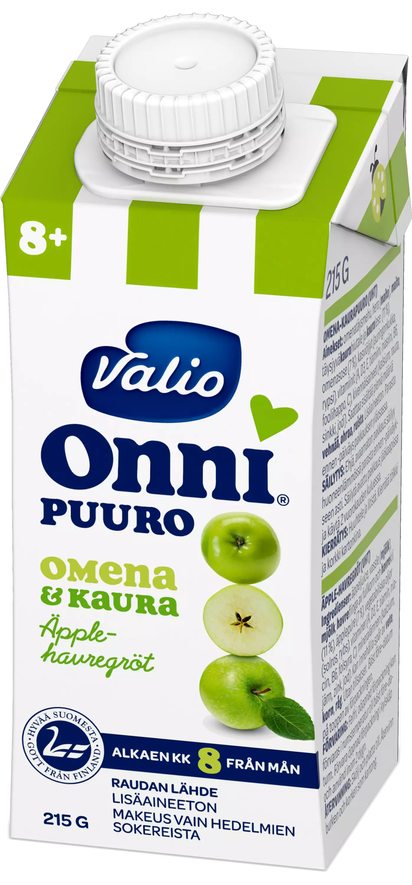 Valio Onni® omena-kaurapuuro on maitopohjainen, karkeampirakenteinen puuro, joka sopii lapsen ruokavalioon 8 kk iästä alkaen. Se sisältää viljoista vain kauraa ja saa makeutensa vain marjoista ja hedelmistä. Hieman karkeampi rakenne syntyy kaurahiutaleista ja -leseistä. Puurossa käytetyn maidon proteiinikoostumus vastaa alle 10 kk ikäisen ravitsemuksellisia tarpeita. Lempeän omenainen ja miellyttävän pehmeä puuro on UHT-käsitelty ja säilyy avaamattomana huoneenlämmössä. Se onkin kätevä matkaeväs. Korkillisesta pakkauksesta puuroa on helppo annostella vaikka suoraan lusikkaan. Tarjoa sellaisenaan huoneenlämpöisenä tai lautasella lämmitettynä.