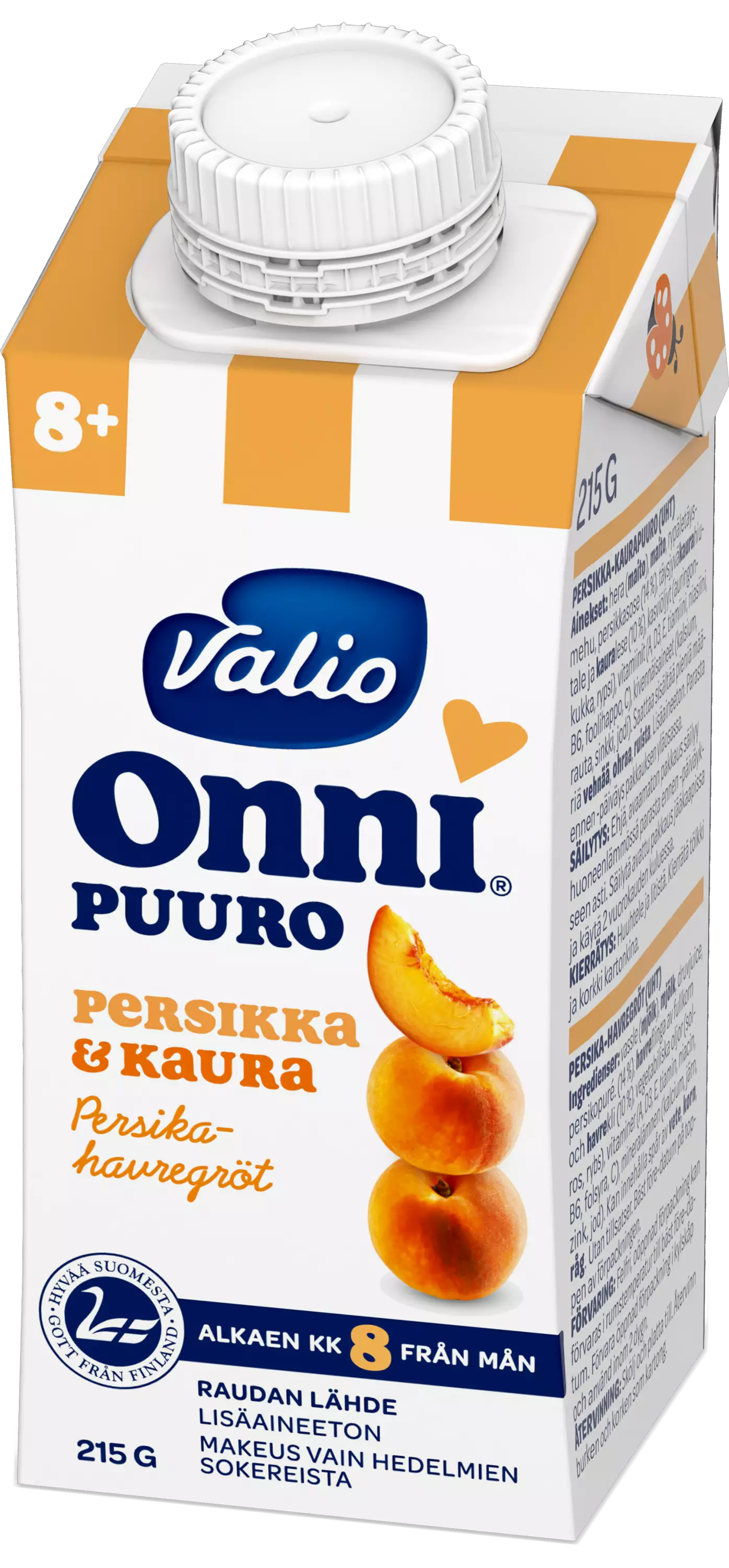 Valio Onni® persikka-kaurapuuro on maitopohjainen, karkeampirakenteinen puuro, joka sopii lapsen ruokavalioon 8 kk iästä alkaen. Se sisältää viljoista vain kauraa. Maistuva yhdistelmä kauran pehmeyttä ja raikasta persikkaa! Hieman karkeampi rakenne syntyy kaurahiutaleista ja -leseistä. Puurossa käytetyn maidon proteiinikoostumus vastaa alle 10 kk ikäisen ravitsemuksellisia tarpeita. Ihanan hedelmäinen ja miellyttävän pehmeä puuro on UHT-käsitelty ja säilyy avaamattomana huoneenlämmössä. Se onkin kätevä matkaeväs. Korkillisesta pakkauksesta puuroa on helppo annostella vaikka suoraan lusikkaan. Tarjoa sellaisenaan huoneenlämpöisenä tai lautasella lämmitettynä.