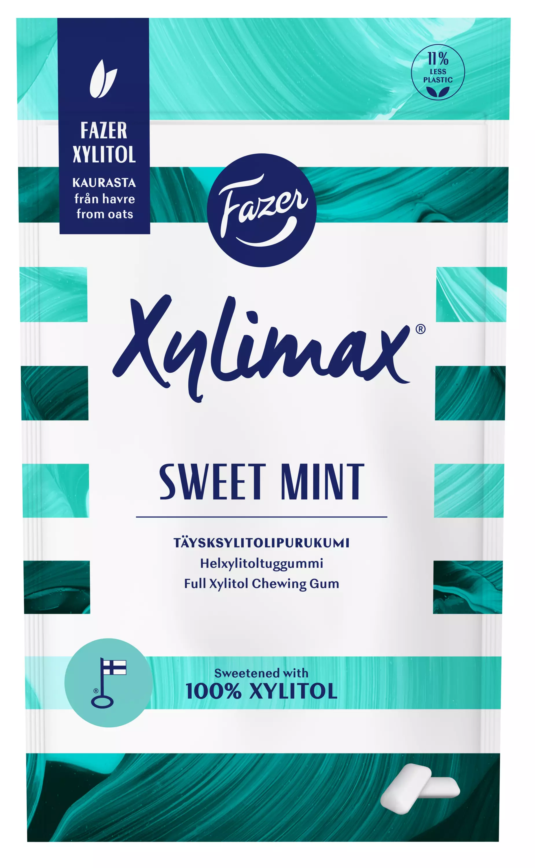 Kotimaiset Xylimax-täysksylitolipurukumit tuovat raikkautta elämääsi. Xylimax Sweet Mint -purukumissa on ihanan lempeä, mieto mintun maku. Se on makeutettu kokonaan ksylitolilla, joka on todistetusti hyväksi hampaillesi. Suomen Hammaslääkäriliitto suosittelee ksylitolia. Purukumi on makeutettu kotimaisella Fazer Xylitol-makeutusaineella, joka on valmistettu vastuullisesti oman myllyn kauran kuorista. Riittoisa, uudelleen suljettava pussi kulkee kätevästi mukana matkassasi.