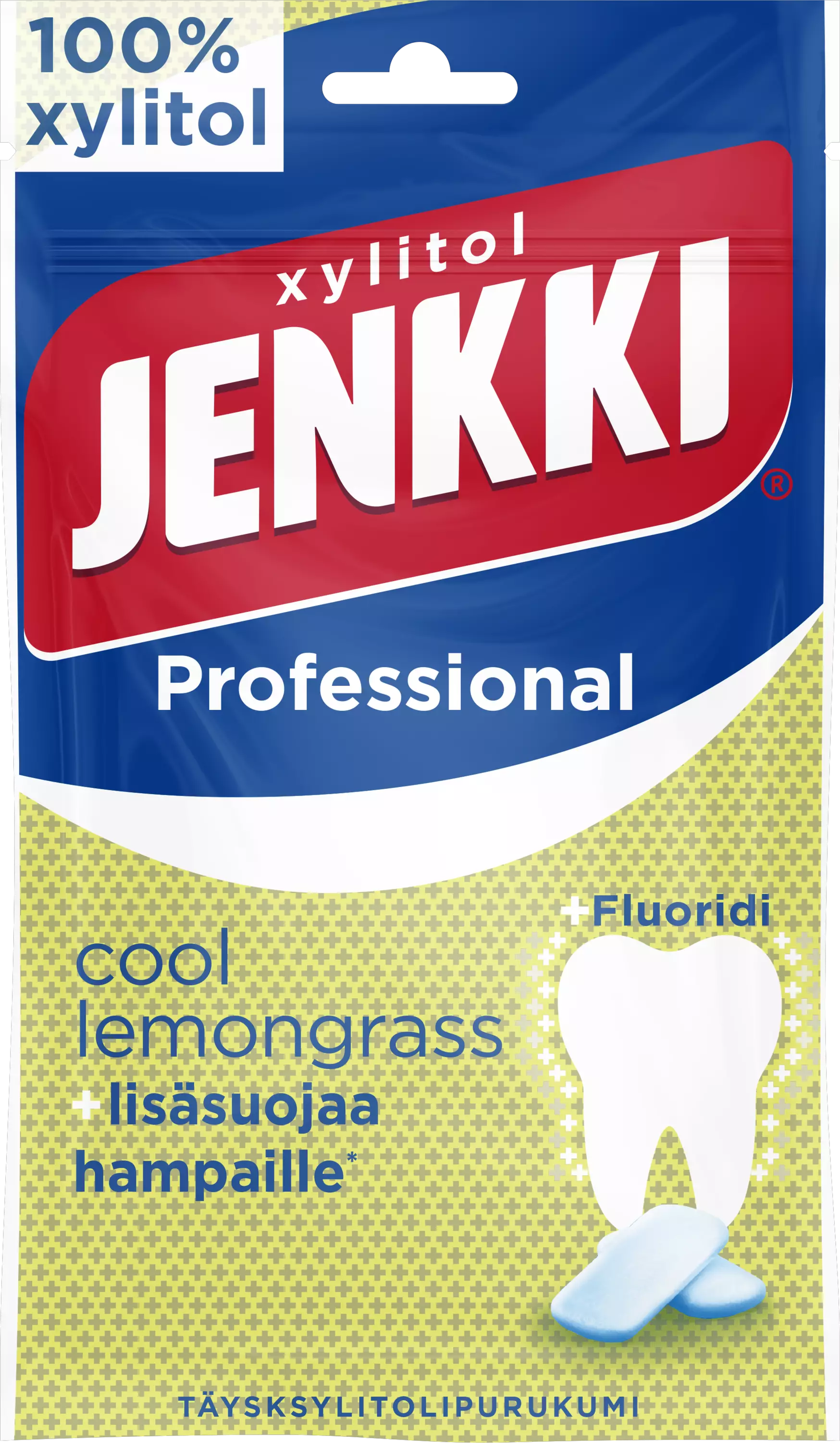 Jenkki Professional cool lemongrass +Fluoridi -täysksylitolipurukumi on makeutettu kokonaan ksylitolilla, eikä se sisällä muita makeutusaineita. Sitruunaruohon makuinen täysksylitolipurukumi sisältää hampaiden hoidossa yleisesti käytettyä fluoridia. Fluoridipitoinen täysksylitolipurukumi tuo tehokasta lisäsuojaa hampaille. Se on helppo vaihtoehto edistää hampaiden mineralisaation ylläpitämistä eli hampaan kiilteen kovettumista. Käyttösuositus on 2 purkkapalaa enintään kolmesti päivässä. Sopii yli 6-vuotiaille, jotka haluavat päivittäistä lisäsuojaa hampaille. Kaksi purkkapalaa sisältää 0,23 mg fluoridia. Purukumilla on Suomen Hammaslääkäriliiton suositusmerkki. Ravitsemussuosituksissa suositellaan käytettäväksi ksylitolia 5 g tai enemmän päivässä. Saat sen nauttimalla kaksi palaa Jenkki-ksylitolipurukumia kolme kertaa päivässä. Sokeriton purukumi auttaa neutraloimaan happohyökkäystä. Kokonaan ksylitolilla makeutetun purukumin on osoitettu vähentävän hampaiden plakkia. Plakin suuri määrä on karieksen kehittymisen riskitekijä lapsilla. Vaikutus saavutetaan pureskelemalla kaksi palaa Jenkki-täysksylitolipurukumia 5-20 minuuttia syömisen tai juomisen jälkeen. Hampaiden reikiintymisen ehkäisyssä tärkeintä on kokonaisuus. Pidäthän hampaistasi muutenkin hyvää huolta. Käyttösuositus kolme kertaa päivässä 2 palaa = 6 palaa/pvä, sisältää: 0,68 mg fluoridia (19 % päivittäisen saannin vertailuarvosta) 5 grammaa ksylitolia (100 % suosituksesta) Tuote sisältää fluoridia 8 mg/100 g (230 %päivittäisestä fluoridin saantisuosituksesta).