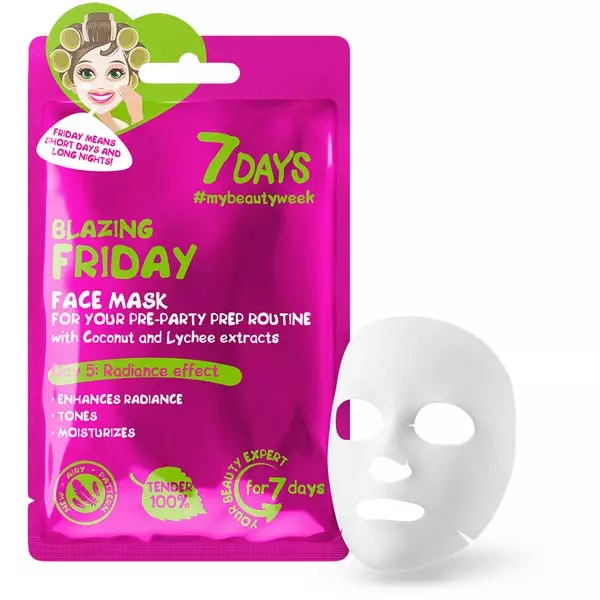 Valmistaudu viikon huikeimpiin juhliin 7 Days Blazing Friday -kangasnaamion avulla! Tämä virkistävä naamio sisältää lychee-uutetta, joka kirkastaa ihoa ja vähentää väsymyksen merkkejä, jättäen ihon heleän ja energisen näköiseksi. Kookosvesi ja tehokkaasti kosteuttava hyaluronihappo lisäävät ihon kimmoisuutta ja pehmeyttä, kun taas vitamiinirikas koostumus tasoittaa ihon sävyä ja rakennetta.7 Days -sarjasta löydät täydellisesti eri viikonpäiville suunnitellut kasvonaamiot jokaiseen hetkeen!