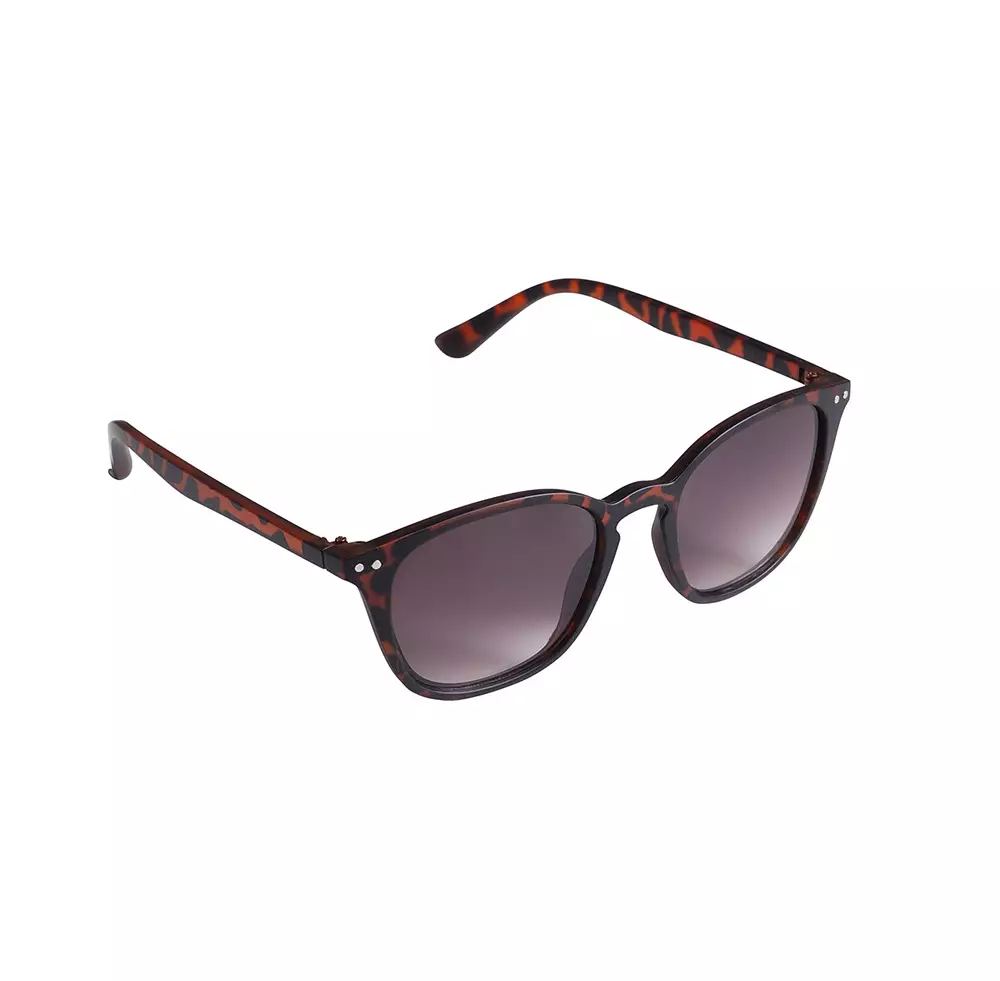 Ajaton, hieman korkeampi kaupunkilasi kesään, sekä miehille että naisille. Ruskeakuvioinen mattapintainen kehys, linssin väri liukuvärjätty ruskea. Muovikehys. 100 % UV-suoja. Linssin Kat. 3. Lasin korkeus 4,5 cm ja leveys 14,5 cm.
