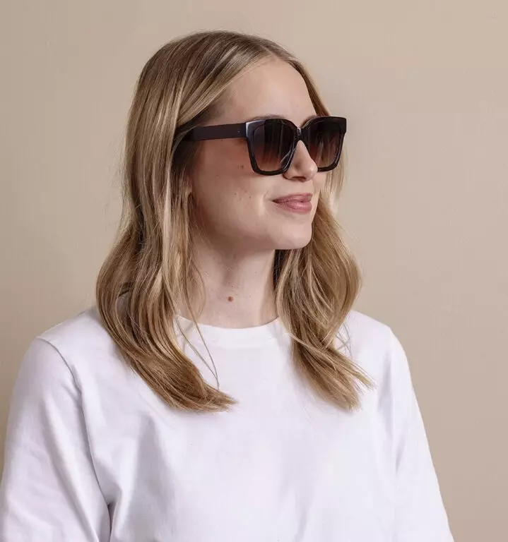 Trendikäs, hieman kookkaampi kulmikas aurinkolasimalli naisille. Kehys läpikuultavan ruskea, linssin väri liukuvärjätty ruskea. Muovikehys. 100 % UV-suoja. Linssin Kat. 3. Lasin korkeus 5,5 cm ja leveys 14,5 cm.