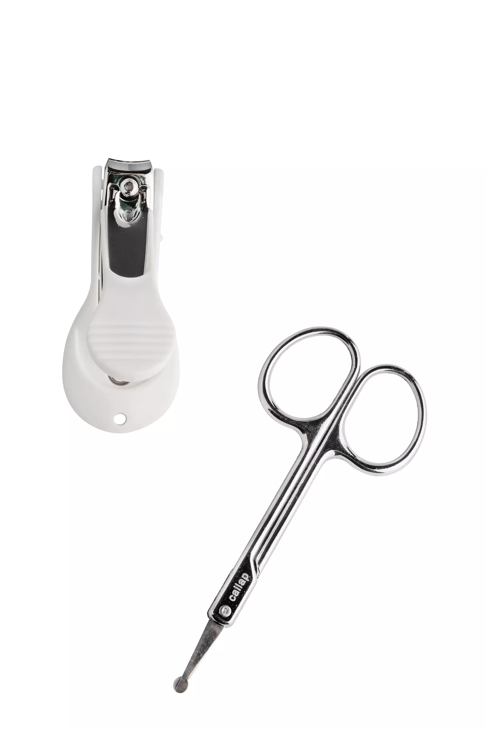 Kynsileikkurit ja tylppäkärkiset sakset. Setti, jossa pienet kynsileikkurit ja tylppäkärkiset sakset. Toimii hyvin esimerkiksi lasten kynsien leikkuuseen. Kynsileikkurissa pieni teräosa, mutta napakka ja hyvä varsi josta saa aikuinenkin hyvän otteen.