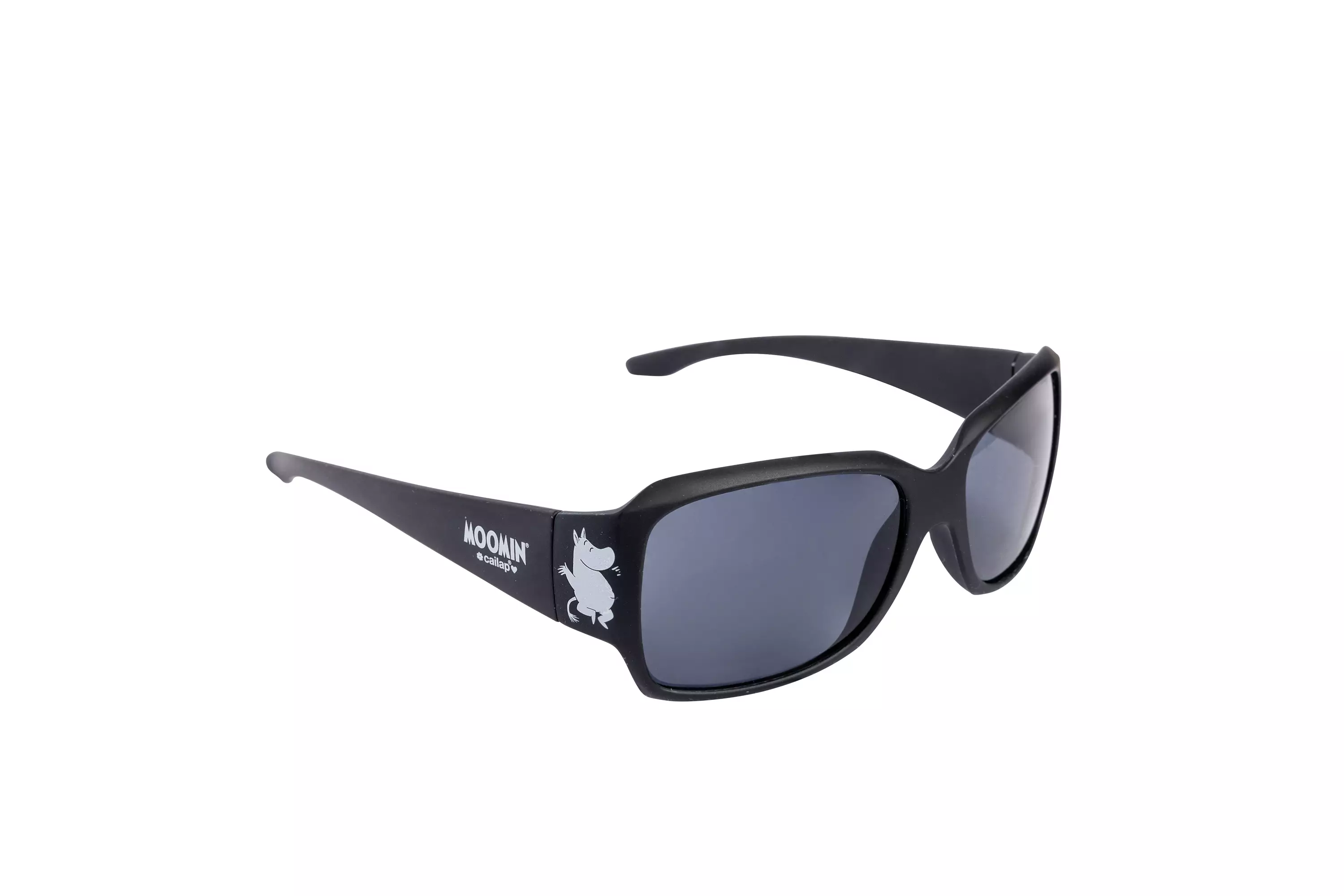 Muumipeikko aurinkolasit. Kehykset mattamustat, kulmassa Muumipeikko printti ja sangoissa Moomin logo. Linssin väri harmaa. Muovikehys. 100 % UV-suoja. Linssin Kat. 3. Lasin korkeus 4,5 cm, leveys 12,5 cm.