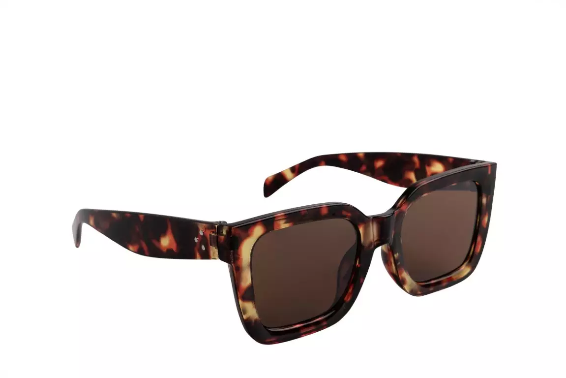 Trendikäs, hieman kulmikas aurinkolasimalli naisille. Kehys läpikuultavan ruskeakuvioinen, linssin väri ruskea. Muovikehys. 100 % UV-suoja. Linssin Kat. 3. Lasin korkeus 5cm, leveys 14,5cm.