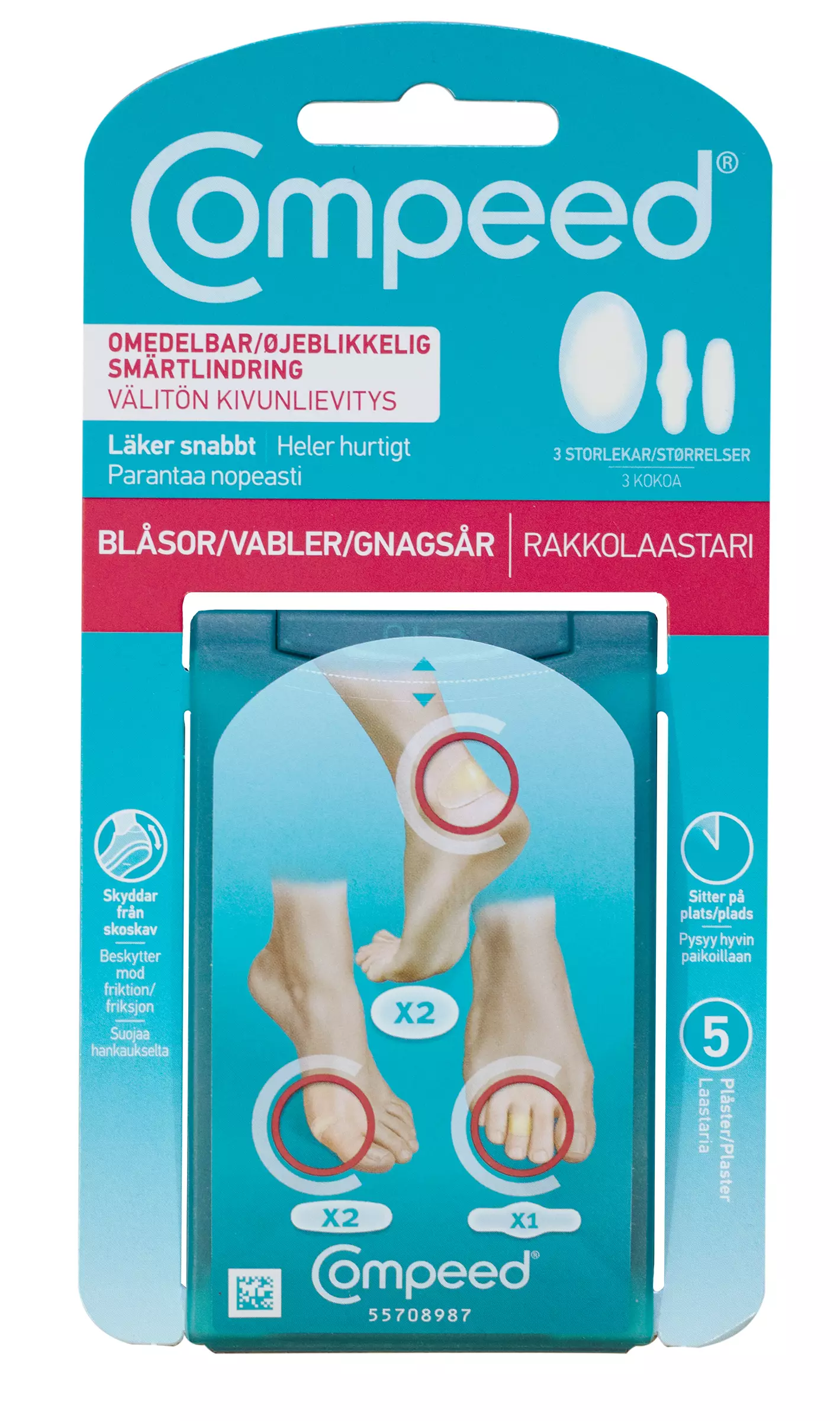 COMPEED® Mix pack -rakkolaastaripakkaus sisältää 2 kantapäärakkolaastaria, 2 pientä rakkolaastaria ja 1 rakkolaastarin varpaille. Pakkaus sopii täydellisesti sinulle, perheellesi ja ensiapupakkaukseksi vaikka matkalle. COMPEED®-rakkolaastari imee ylimääräisen kosteuden ja muodostaa suojaavan pehmusteen sekä lievittää välittömästi kipua ja luo optimaaliset olosuhteet jalkarakkojen paranemiselle. Polyuretaanista valmistettu rakkolaastari sisältää hydrokolloidihiukkasia, jotka imevät jalkarakosta erittyvää solunestettä. Hydrokolloidihiukkaset muodostavat laastarissa geeliä, joka muodosta pehmeän tyynyn hiertymän päälle. Tyyny suojaa rakkoa paineelta ja kivulta sekä lialta ja bakteereilta. Lisäksi laastari on vedenkestävä. Muotoiltu ja hengittävä rakkolaastari takaa optimaalisen paranemisympäristön. Rakko ei kuivu eikä rupeudu hydrokolloidigeelin takia. Siksi rakko myös paranee nopeammin kuin tavallista laastaria käytettäessä. Tarjolla on monia eri kokoja erikokoisten rakkojen hoitoon. Diabeetikoiden tulee keskustella lääkärin kanssa ennen käyttöä. Älä käytä tulehtuneeseen haavaan. Jos rakko pahenee tai ei parane, lopeta käyttö ja ota yhteyttä lääkäriin.