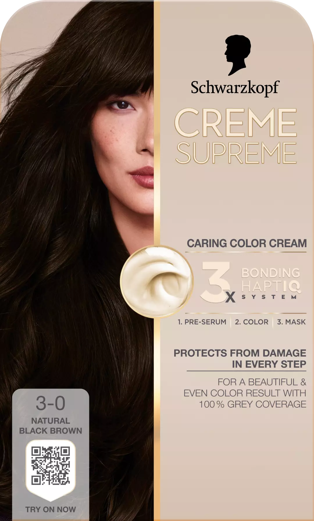 Schwarzkopf Creme Supreme 3-0 Natural Black Brown - The color you desire with the care you deserve.Tässä hoitavassa Schwarzkopf-hiusvärissä on 3x Bonding HaptIQ -teknologia, joka valmistelee värjäykseen, suojaa ja vahvistaa hiuksia kauniin ja tasaisen värituloksen saavuttamiseksi ja peittää harmaat hiukset 100 %.Kuinka se toimii?Bonding pre-seerumi: Intensiivisesti ravitseva esikäsittely Schwarzkopf Bonding HaptIQ -teknologialla valmistelee hiukset hiusten värjäysprosessia varten. Se luo uusia mikrosäikeitä ja tasoittaa hiuksia kauniin ja tasaisen värituloksen saavuttamiseksi.Bonding-värivoide: Suojaa hiuksia uusilta vaurioilta värjäyksen aikana kauniin tuloksen saavuttamiseksi.Bonding-hiusnaamio: Suojaa hiuksia suojaavalla kerroksella ja kehittää uusia mikrosäikeitä taatakseen intensiivisesti hoidetut hiukset.Tuotteen edut:Hoitava Color CremeSuojaa hiusta vaurioiltaKaunis ja tasainen väritulosPeittää harmaat hiukset 100 %PETA:n hyväksymä*3-0 Luonnollinen Mustanruskea*Kansainvälinen eläinkokeita koskeva sertifikaatti**Ei sisällä eläinperäisiä ainesosiaFSC-sertifioitu: vastuullisesta lähteestä peräisin olevat pakkaukset