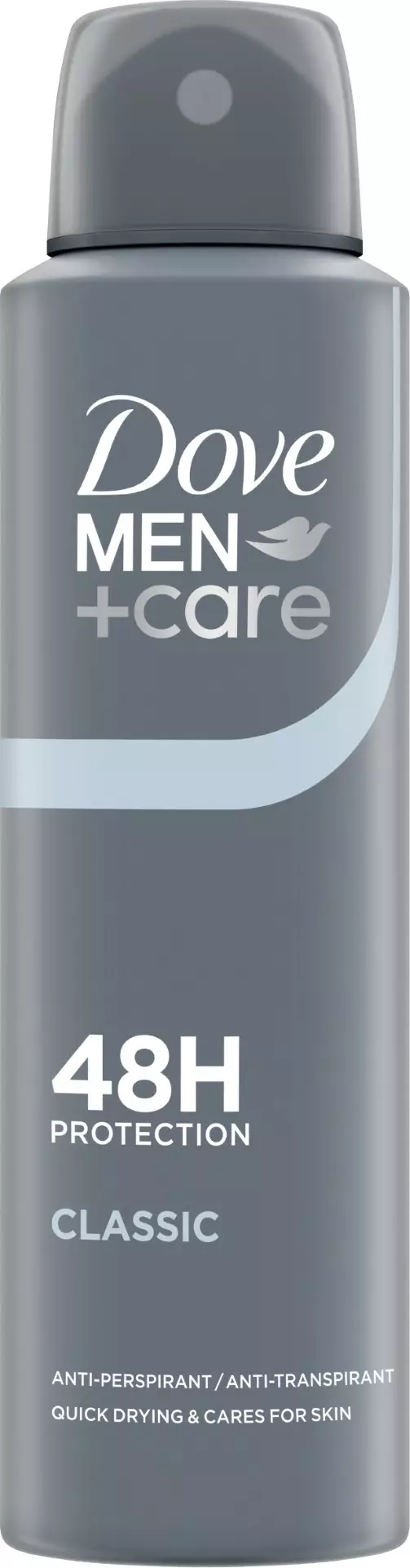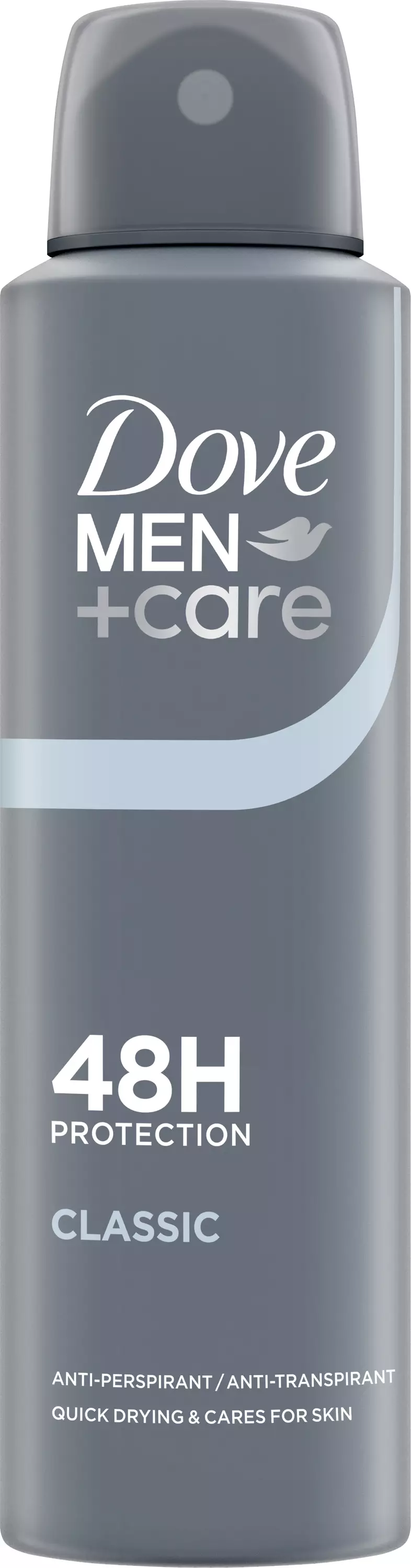 Nyt voit tuoksua raikkaalta ja hyvältä, kiitos Dove Men+Care 48h Classic Antiperspirantti Deodorantti Sprayn! Tämä kosteuttava antiperspirantti deodorantti spray ei jätä sinua pulaan. Jopa 48 tunnin suoja hikoilua vastaan. Dove deodorantti tarjoaa tehokkaan, hoitavan suojan hikoilua vastaan ja siinä on mieto ja raikas tuoksu.Dove Men+Care 48h Classic Antiperspirantti Deodorantti Spray on ankara hielle ja hienhajulle, mutta kosteuttaa ja auttaa suojaamaan ihoa ärsytykseltä ja kuivumiselta, sillä sen koostumuksessa on mukana Doven maailmankuulu kosteusvoide, mutta ei lainkaan alkoholia. Työ. Perhe. Matkat. Elämä on nopeatahtista. Kun et halua hikoilun hallitsevan päivääsi, tarvitset antiperspirantin, joka pysyy menossa mukana. Käytä suihkedeodoranttia näin: Ravista pakkausta aktivoidaksesi ainesosat. Pidä pulloa 15 cm:n etäisyydellä kainalostasi ja varmista, että pullo on suihkuttaessa pystysuorassa. Suihkauta tuotetta kahden tai kolmen lyhyen suihkauksen verran – noin 1-2 sekunnin ajan – ja valmista tuli. Dove lanseerattiin Yhdysvalloissa vuonna 1957, kun markkinoille tuotiin Beauty Bar -palasaippua, jonka patenttisuojattu sekoitus sisältää mietoja puhdistavia ainesosia ja neljänneksen kosteuttavaa voidetta. Sittemmin Dove on kasvanut palasaippuoiden valmistajasta yhdeksi maailman arvostetuimmista kauneusbrändeistä. Dove uskoo, että kauneus kuuluu kaikille. Siksi luotiin Dove Men+Care -sarja, joka rakentuu tälle perinnölle. Se tarjoaa tuotteita, jotka on kehitetty erityisesti miehille. Ne sisältävät samoja hoitavia ominaisuuksia, joista Dove on tunnetaan. Olipa etsimäsi tuote sitten deodorantti, deodoranttisuihke, suihkugeeli tai shampoo, Dove Men+Care tarjoaa sinulle vaihtoehdon. Globaalisti, Dove Men+Care ei testaa eläimillä ja on PETA cruelty-free -sertifioitu.
