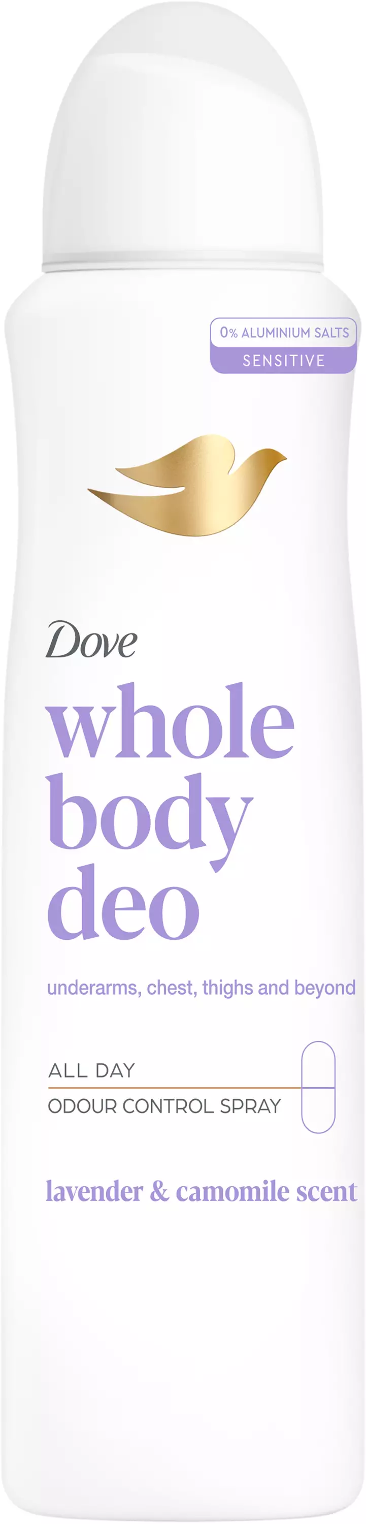 Kehomme hikoilevat ja tuoksuvat mistä tahansa – kysy vaikka rintaliiveiltä pitkän, kuuman päivän jälkeen.Olemme saaneet tarpeeksemme kehon hajusta, joten loimme tämän: koko vartalon deodorantin, joka tarjoaa koko päivän hajukontrollin, hoitaa herkkää ihoa ja antaa itsevarmuutta päästä varpaisiin.Olipa kyseessä helleaalto tai hot jooga, tämä koko vartalon deodorantti on tukenasi – kainaloista rintakehään, reisiin ja muualle.Laventeli & kamomilla All Body deodorantti yhdistää Dove-tuotteista tutun ihonhoidon tehokkaaseen hajukontrolliin koko vartalolle – myös herkille alueille.Koostumus sisältää hoitavia öljyjä ja glyseriiniä. Se pysäyttää hajut jo niiden lähtöpisteessä ja pitää sinut raikkaana.Kun sanomme "koko vartalon deodorantti", me tarkoitamme sitä. Käytä tätä missä tahansa, missä koet kehon hajua – rintojen alla, reisissä, alaselässä, jaloissa, kainaloissa ja muualla.Kyllä, tämä ihoa hellivä koostumus on myös dermatologisesti testattu.Tämä näkymätön deodorantti on läpinäkyvää ja sen sotkuton suunnittelu mahdollistaa helpon koko vartalon käytön.Deodorantti on rikastettu laventeli kamomilla -tuoksulla, joka pitää sinut raikkaana koko päivän – minne tahansa päivä sinut viekin.Vain ulkoiseen käyttöön.