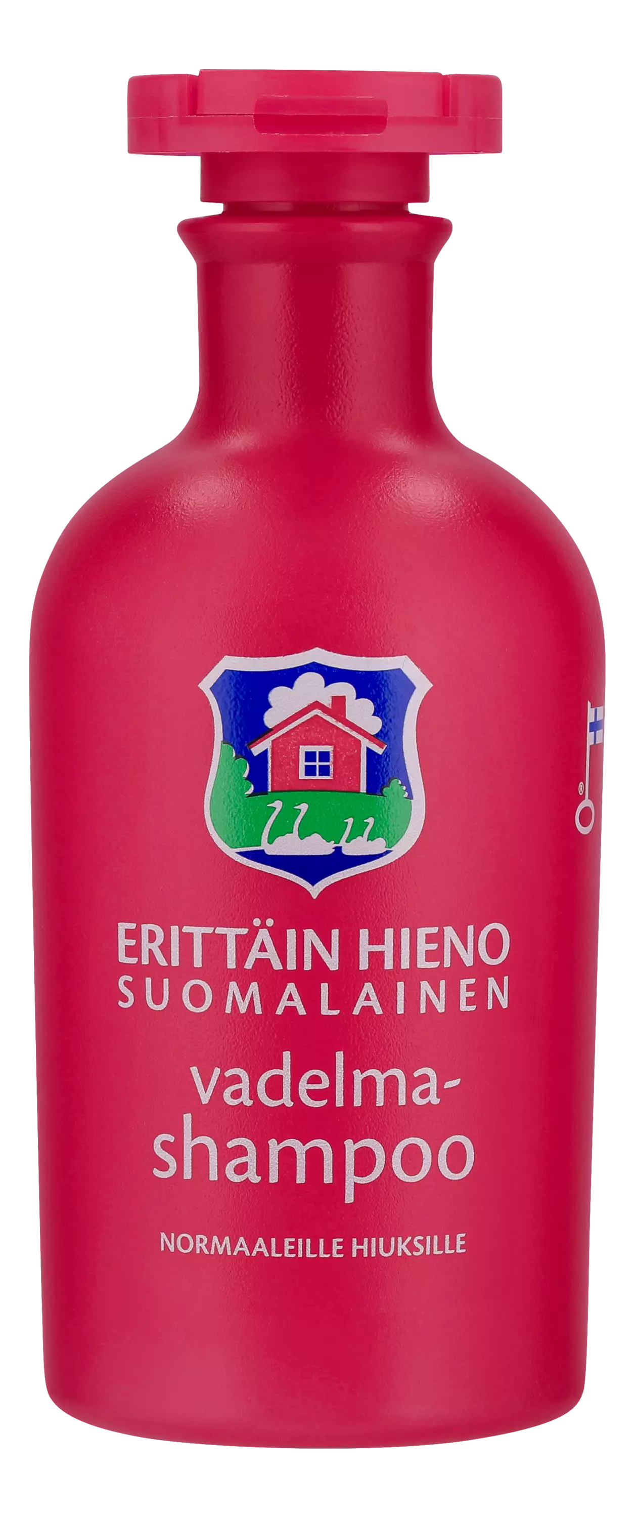 Erittäin Hieno Suomalainen Vadelmashampoo sisältää vadelmauutetta ja pesee hiukset puhtaiksi ja pehmeiksi. Hiukset ovat kuin sadevedellä pestyt. Tuote on valmistettu Suomessa ja sille on myönnetty Avainlippu -tunnus.